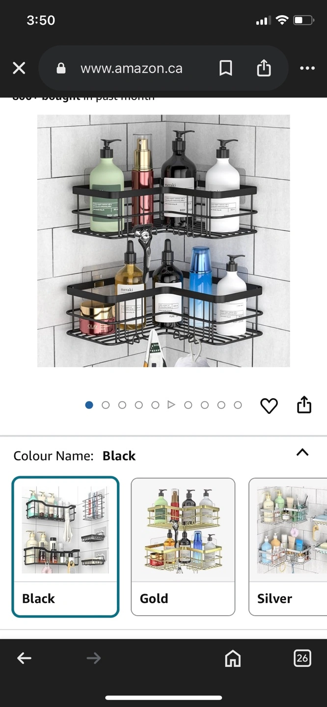 Two-tiered corner shower caddy. Black metal wire frame. Easy to install. Holds various bottles and toiletries.
