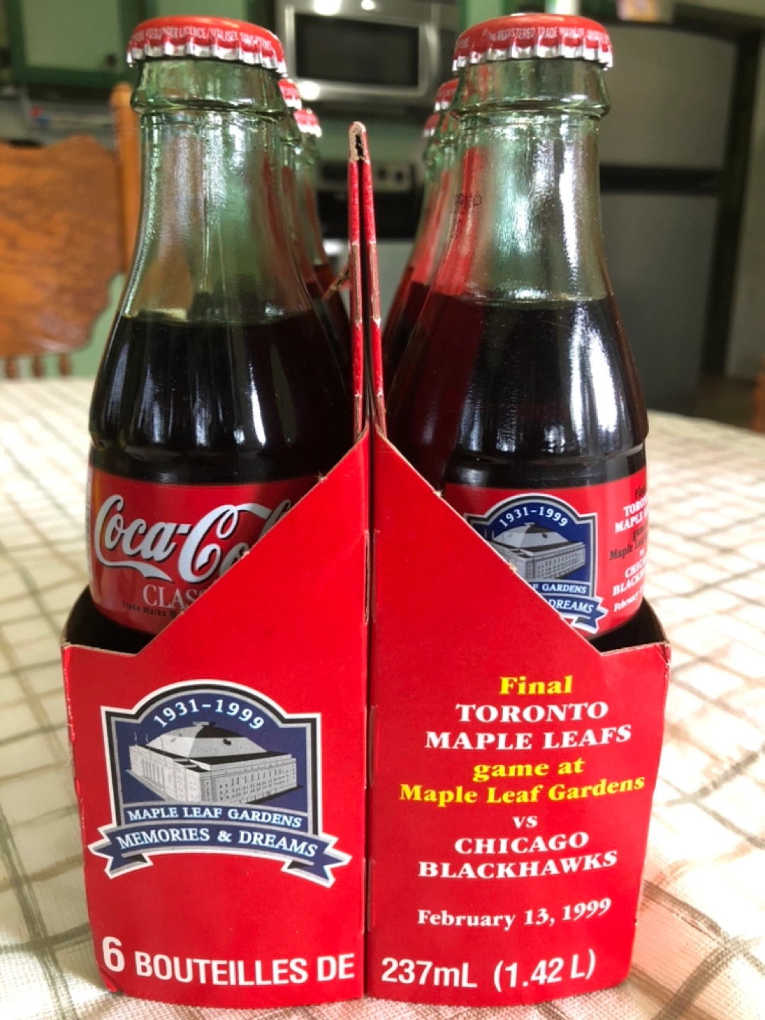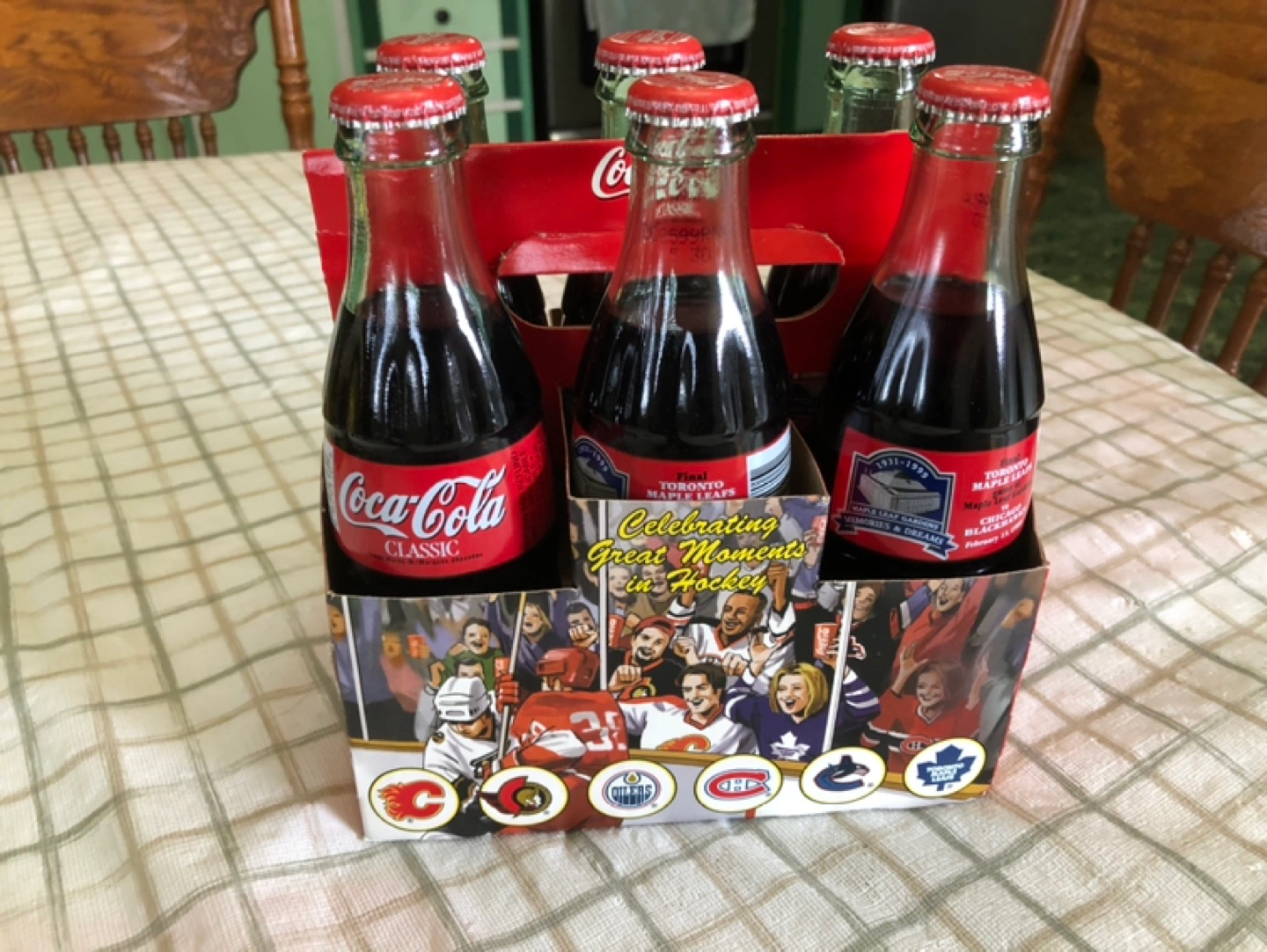 Six 237ml glass Coca-Cola bottles. Maple Leaf Gardens commemorative design. Final game at Maple Leaf Gardens, February 13, 1999. Collectible set in original packaging. Check my other posts