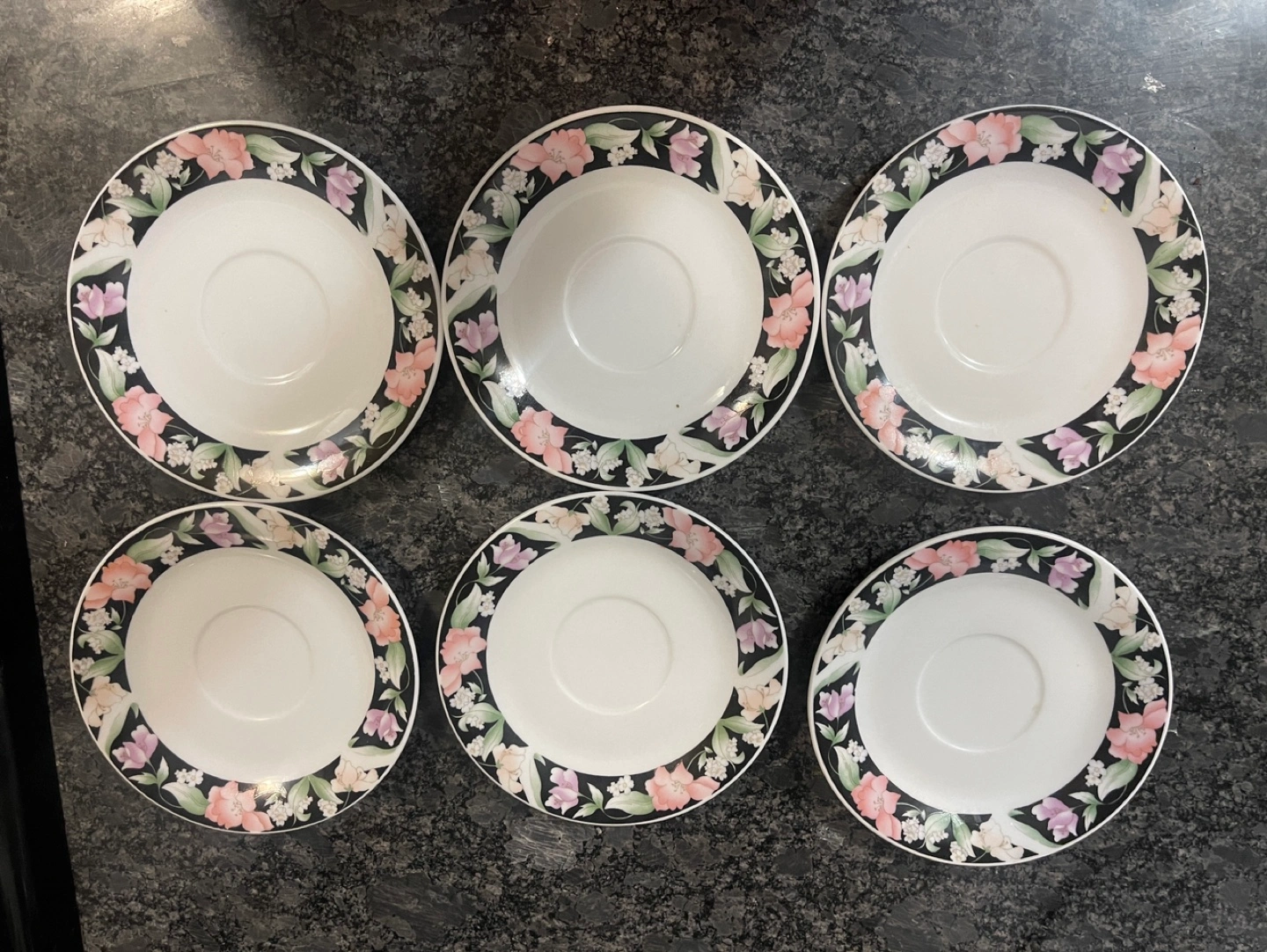Six pretty teacup saucers. Floral design. Black background. Pastel colours.