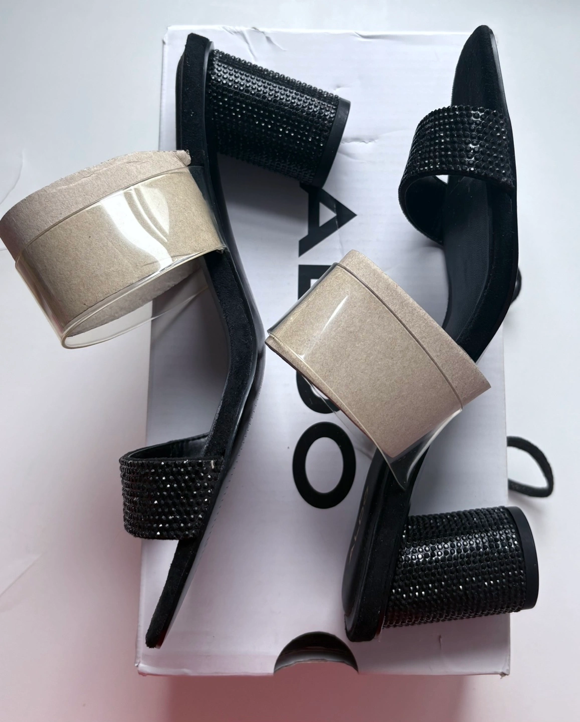 Brand new Stunning black sandals Original box damaged Rhinestone detailing Clear/nude straps. Block heel detailed with rhinestones Size - 6.5 Bought for more then 60$ plus taxes Price is final Cash payment only Pick up - Lansdowne ttc