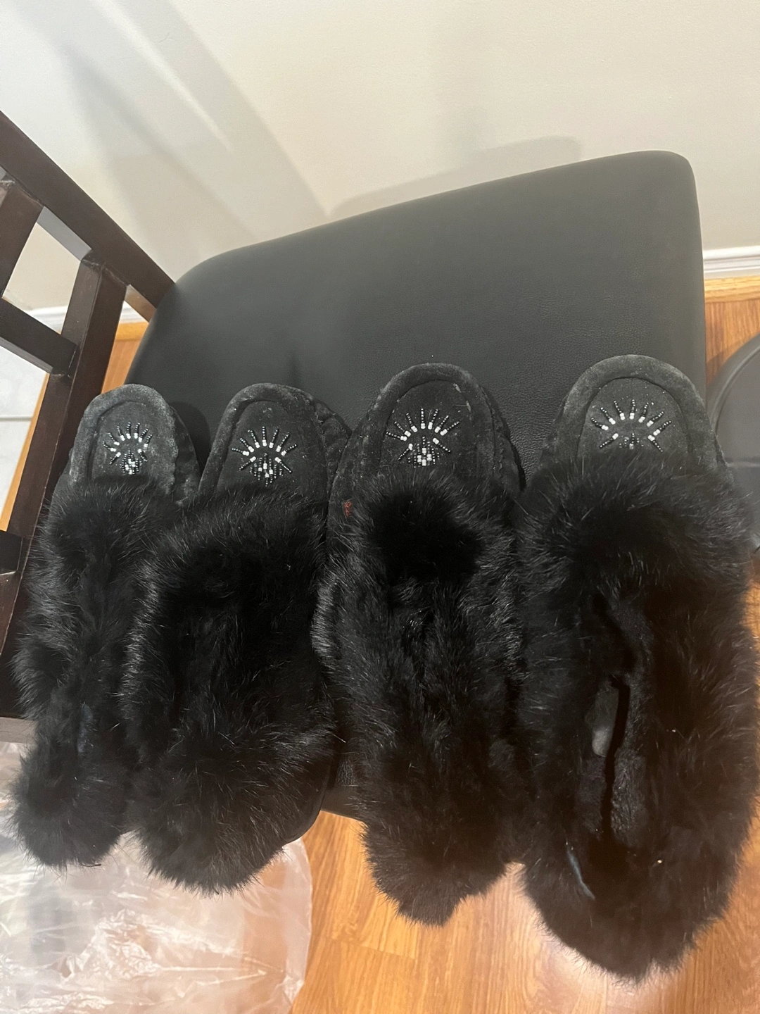 Pair of black fur moccasins. Beaded detail. Soft and cozy. Size 9