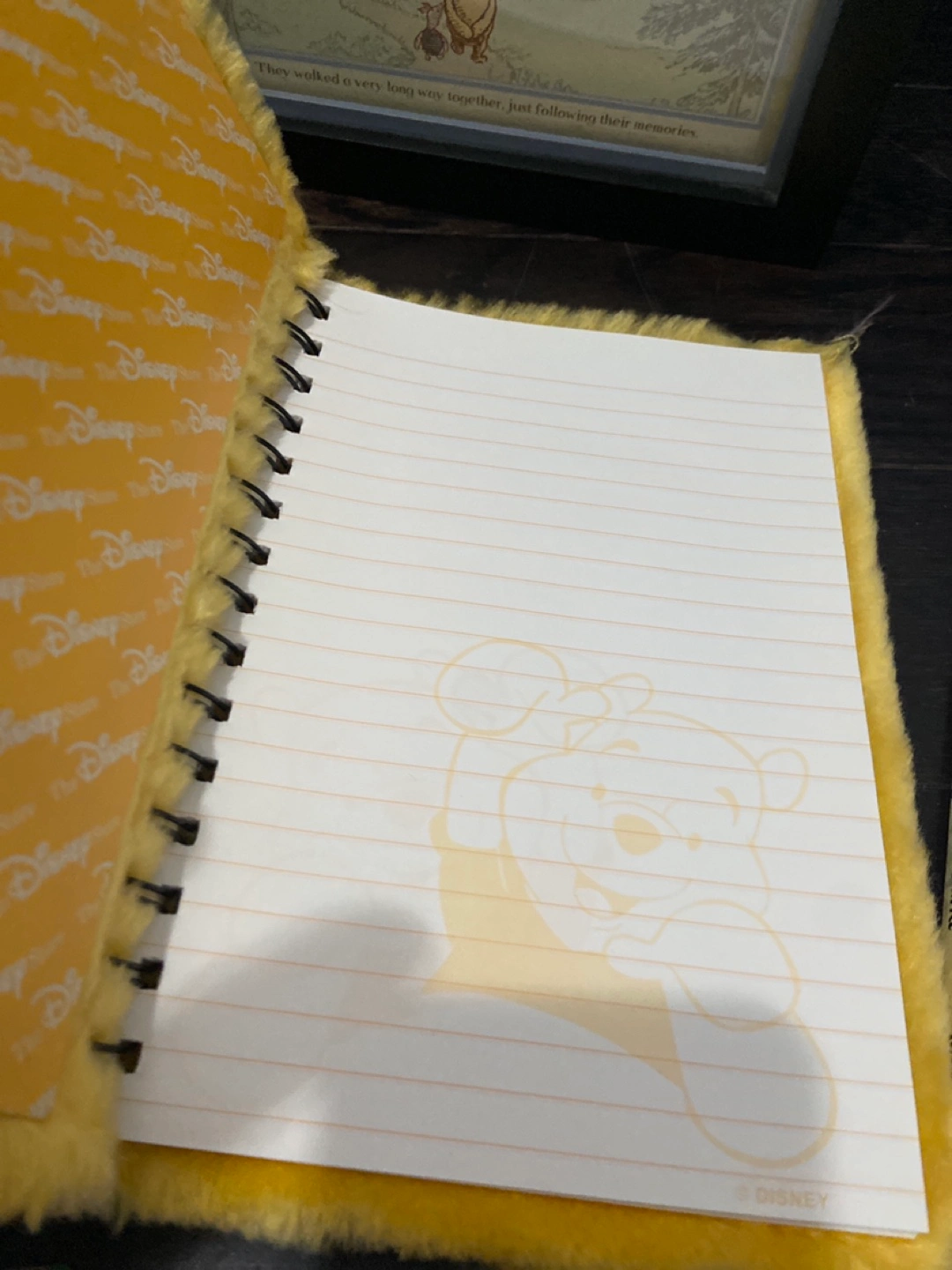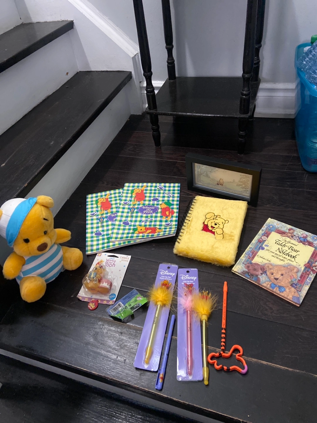 Adorable Winnie the Pooh themed lot. Includes a fuzzy yellow journal, several notebooks, pens, candle stickers. Perfect for a Winnie the Pooh fan! Everything for $60