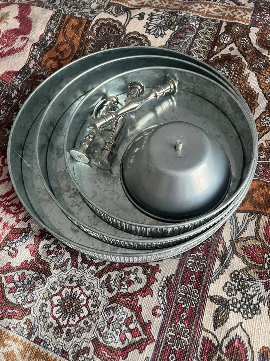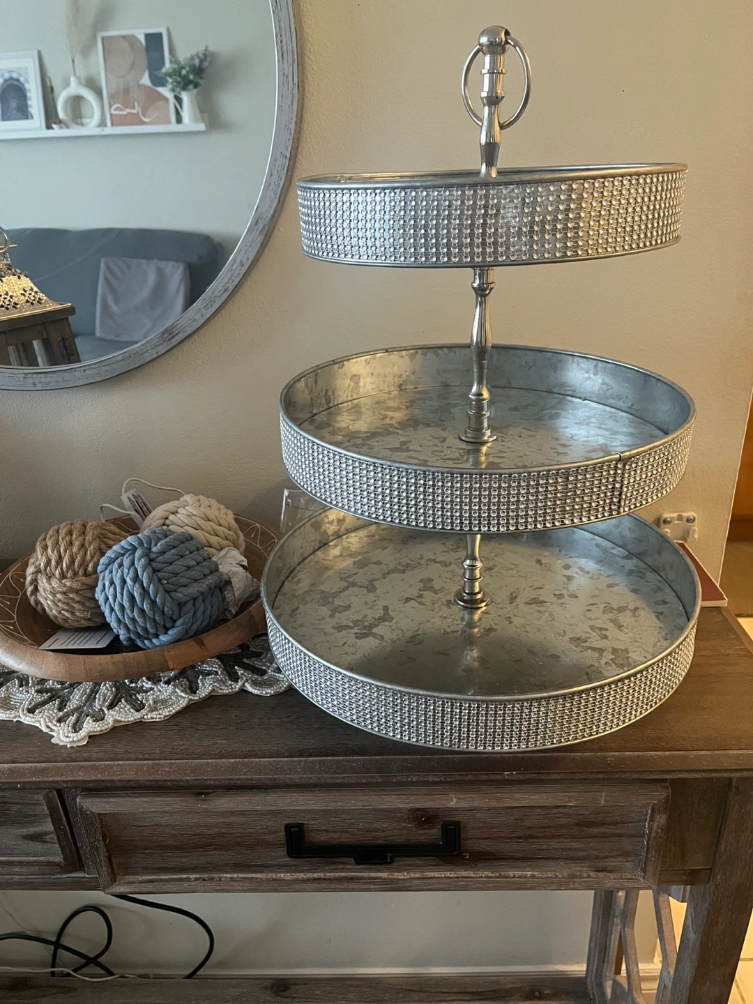 Beautiful three-tiered serving stand. Features galvanized metal trays and a silver stand. Perfect for parties or everyday use.