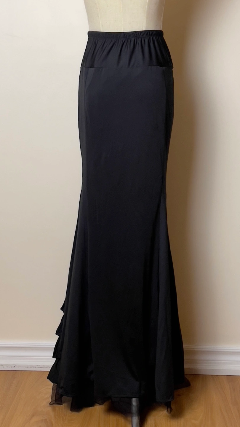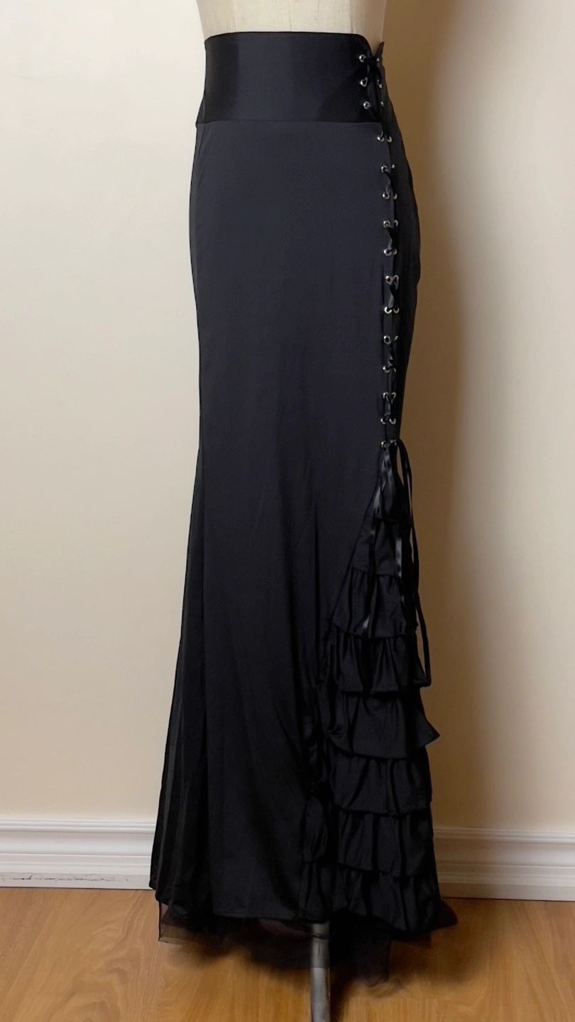 Gorgeous black maxi skirt. Features a fitted mermaid silhouette, layered ruffle detail, and a unique lace-up side. Elastic waistband for comfort. Great for special occasions or evening wear. Hint: Suitable for Gothic Style Outfits