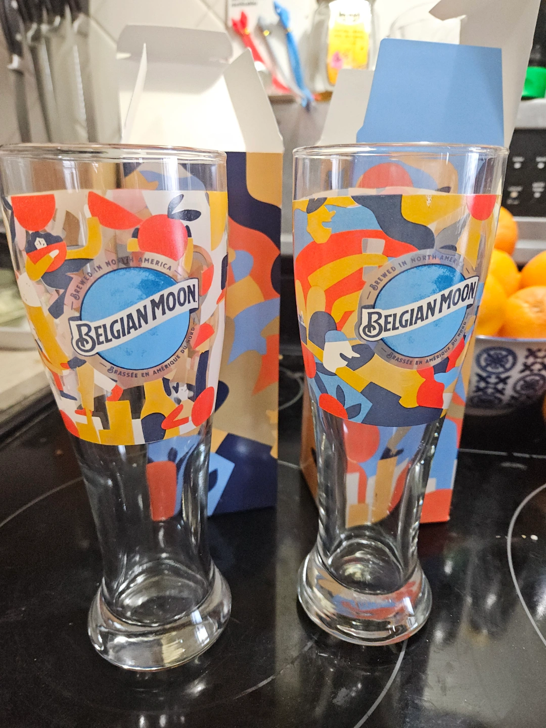$10 each Two Belgian Moon branded beer glasses. Tall, clear glass with colourful design. Comes in original boxes.