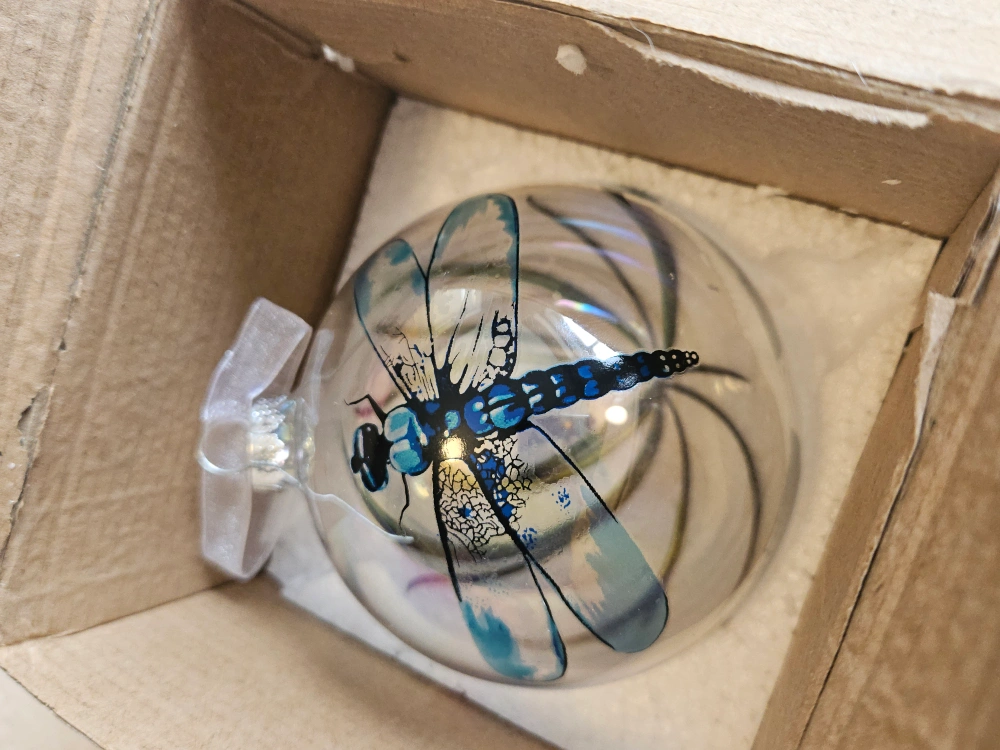Beautiful glass ornament. Features a dragonfly design. Clear glass ball. Comes with a ribbon hanger.