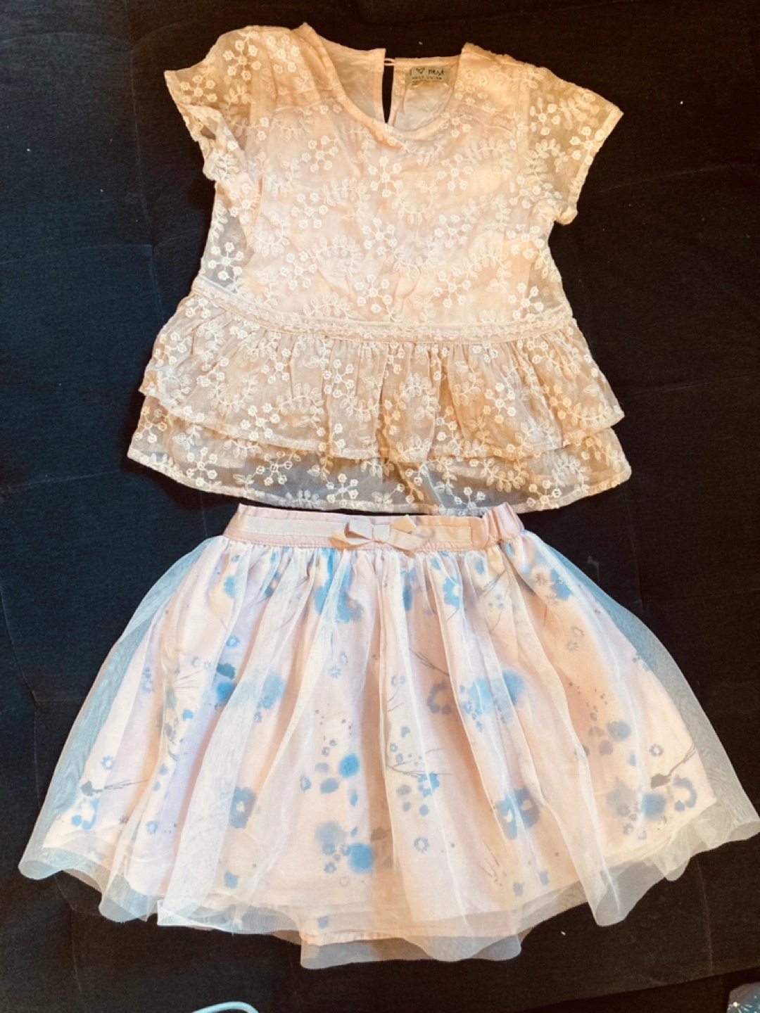 NEXT UK 4 years Adorable girls' outfit. Features a delicate blush pink lace top with a ruffled hem and a matching tulle skirt with a subtle floral print. Perfect for a special occasion, photoshoot or party. Gently used.