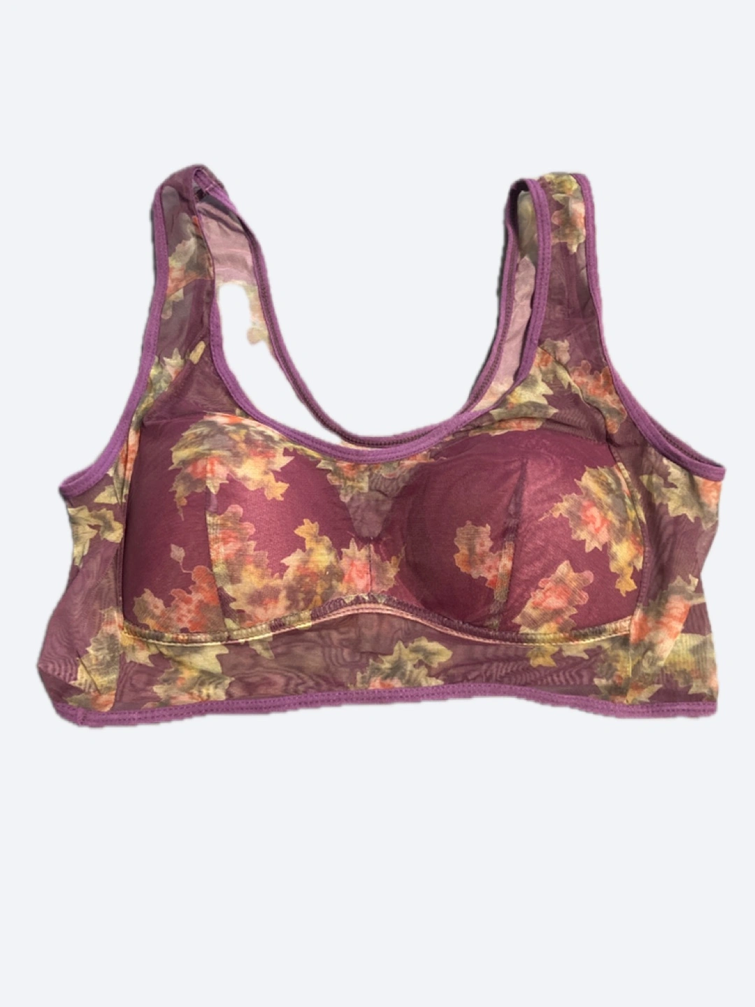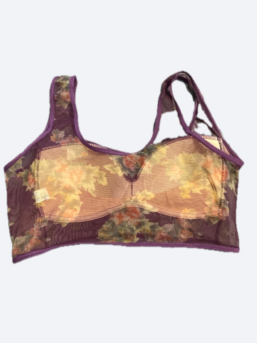 Purple floral bralette. Women's bralette. Features a floral print on a mesh fabric. Light blue trim. Padded cups.