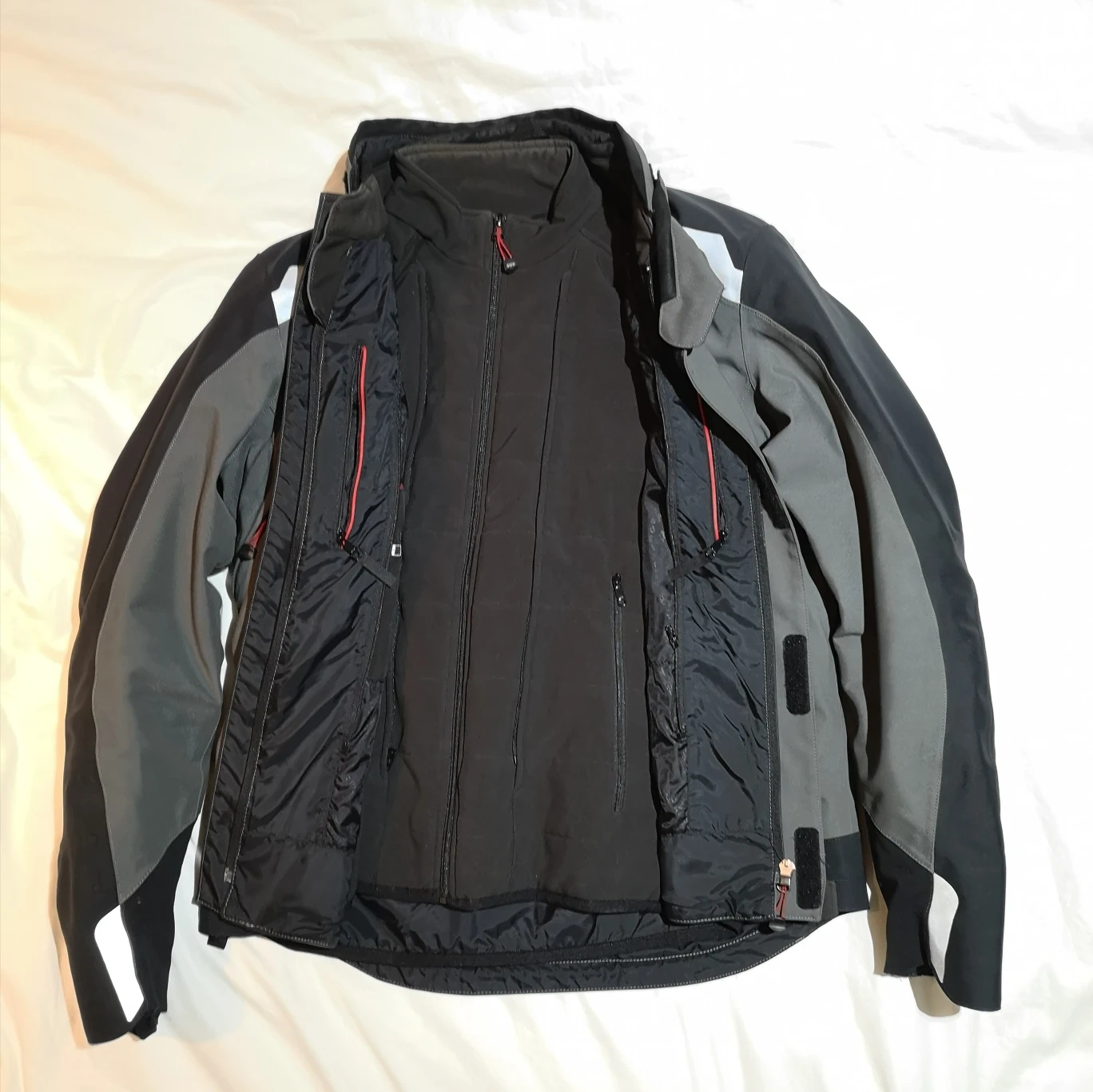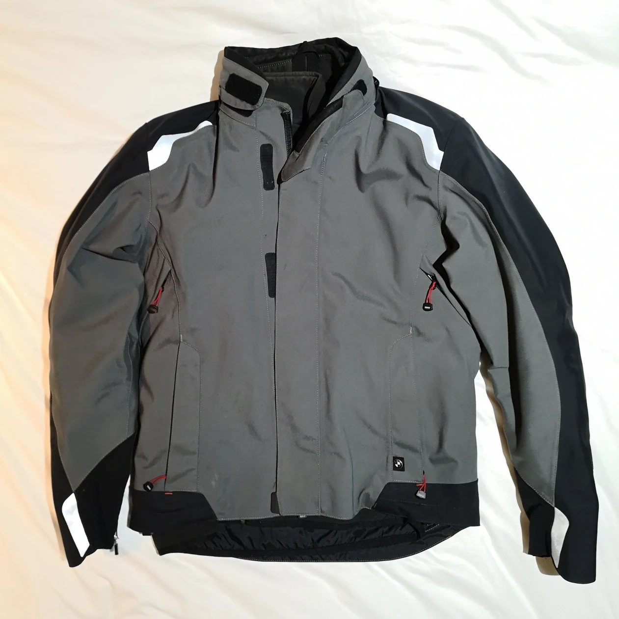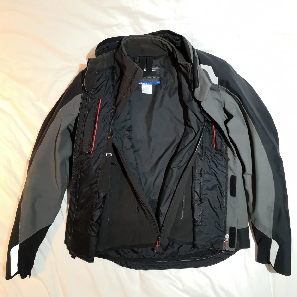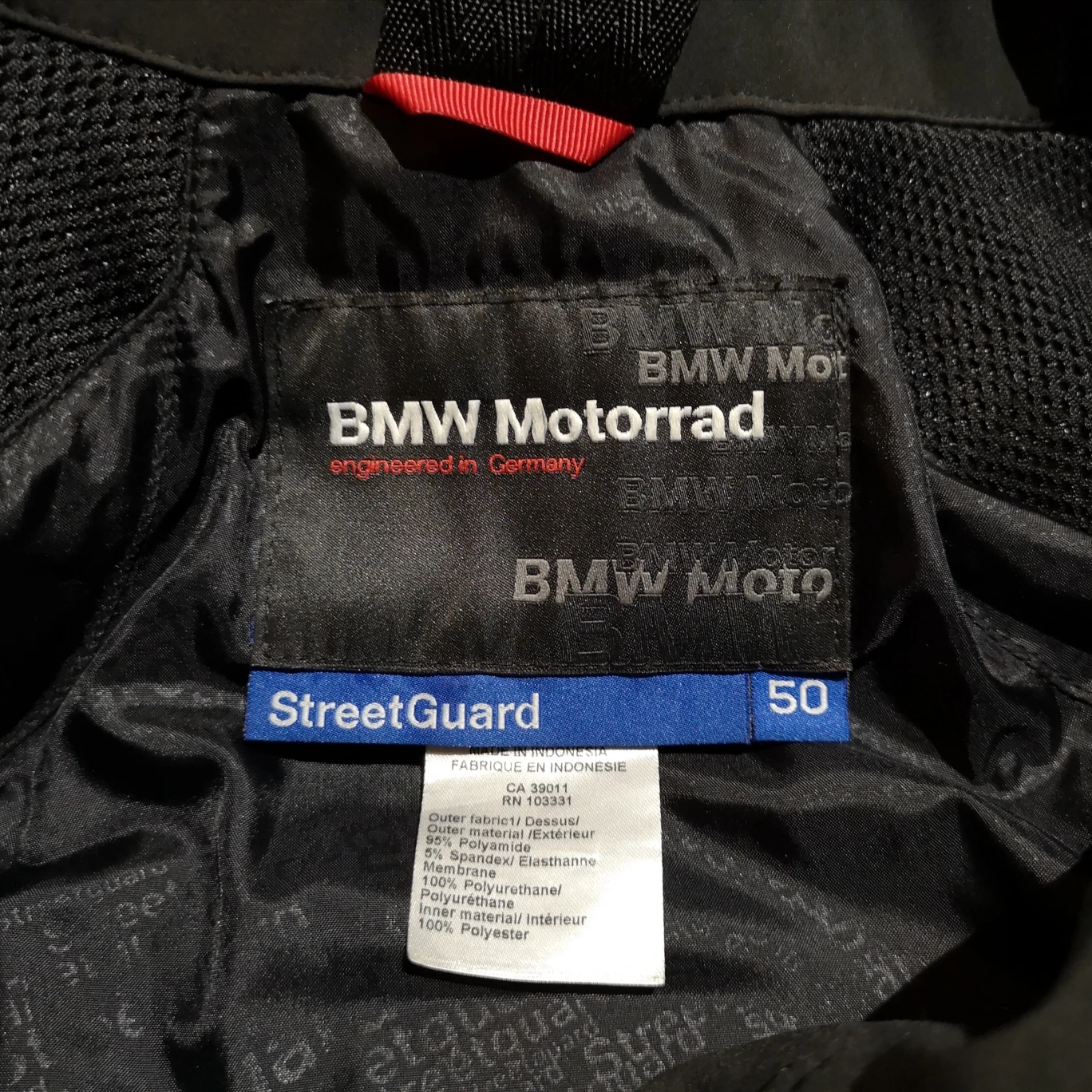 Men's grey and black BMW Motorrad StreetGuard 50 motorcycle jacket. Size 50. Features a zip-up front, multiple pockets, and a detachable inner liner. Waterproof and windproof outer shell. Excellent for riding in various weather conditions. Mint condition.