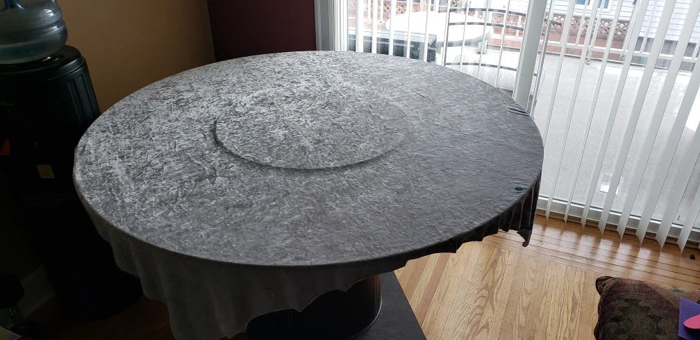 Round glass tabletop. Dark brown pedestal base. Rotating top middle. unique, one of a kind kitchen table or craft table, etc. Some minor wear. will trade for rectangle table.