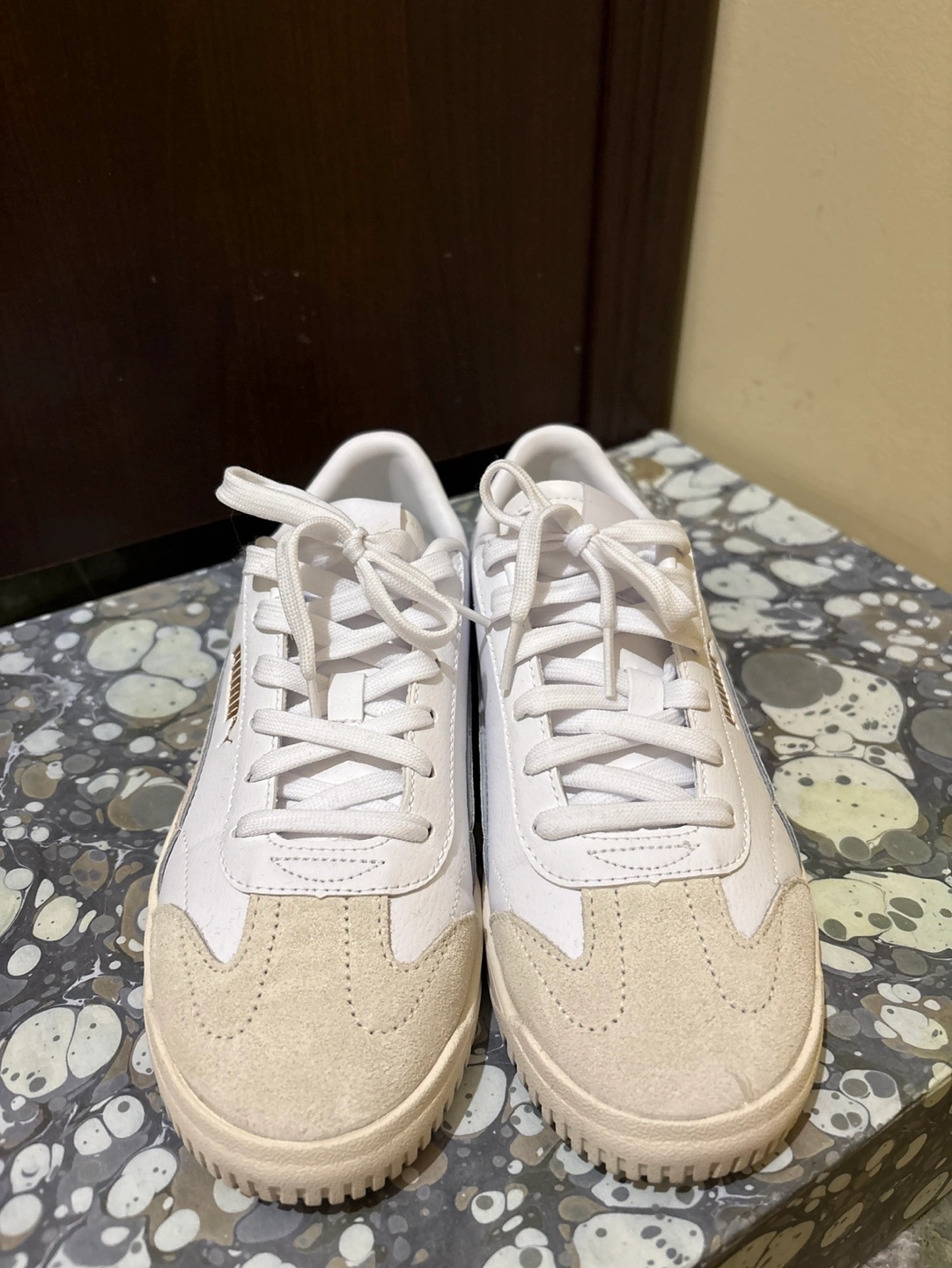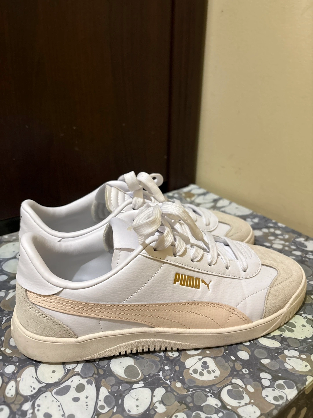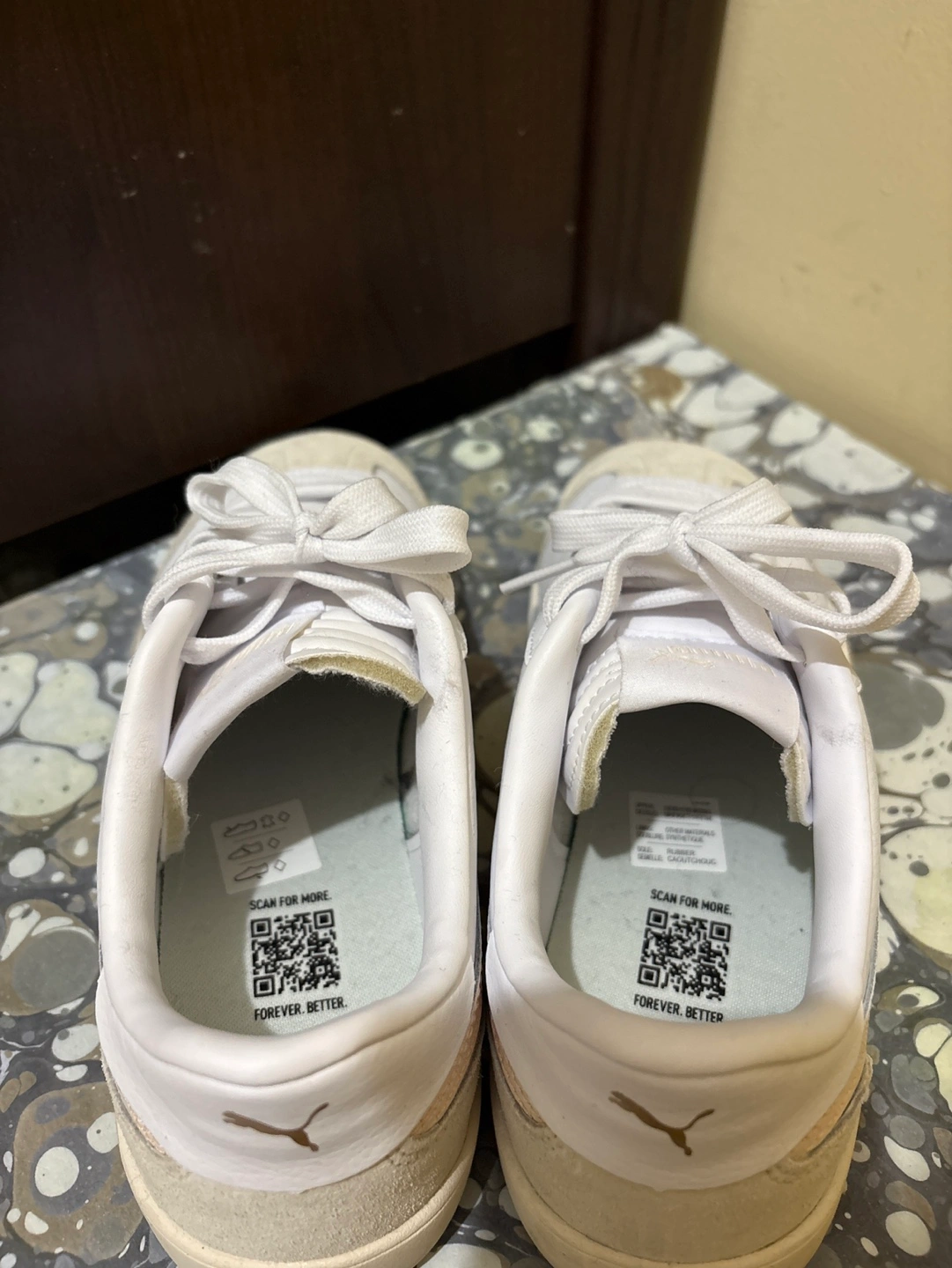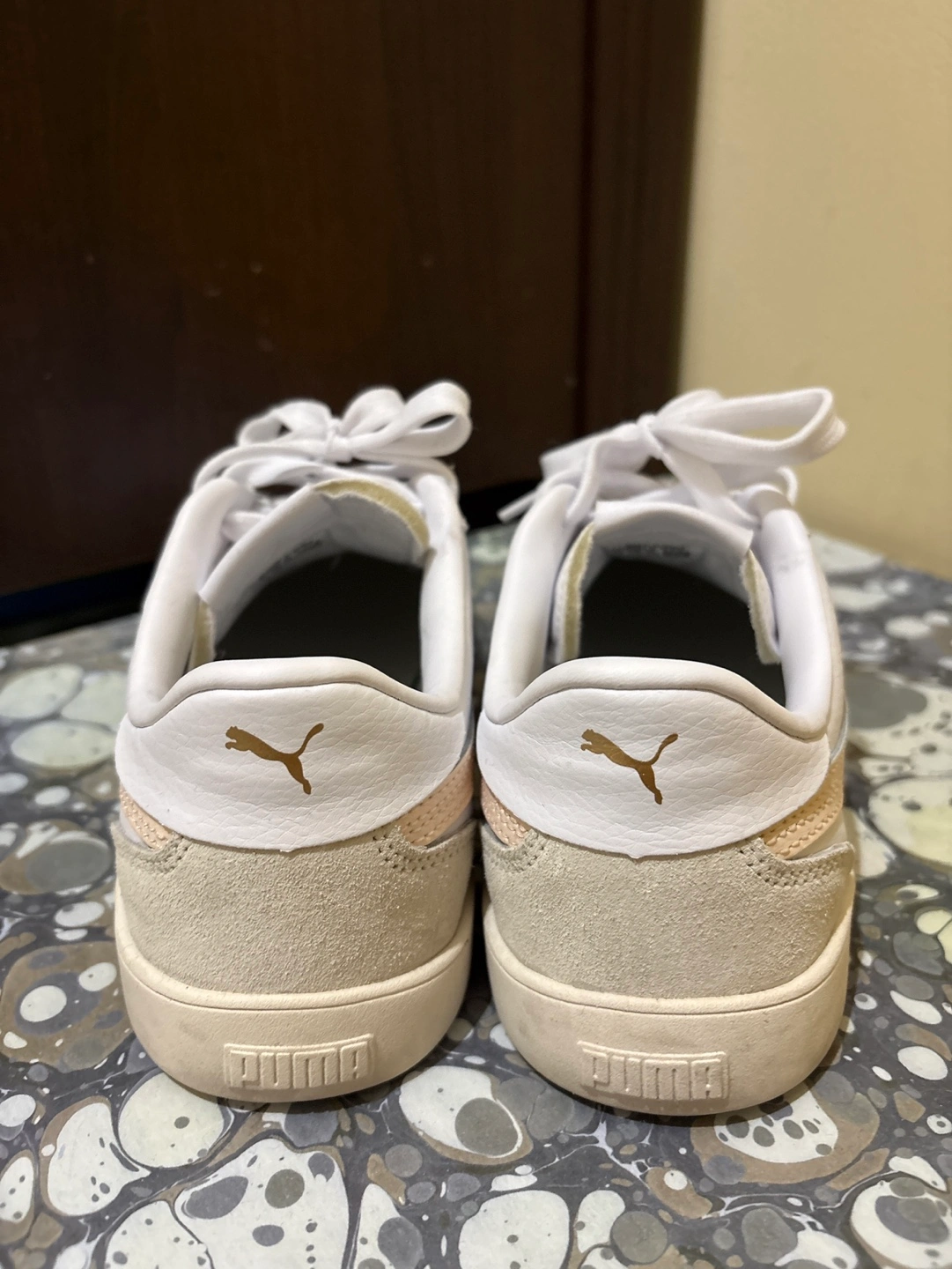 Pair of women's Puma low-top sneakers. White leather upper with beige accents. Cream coloured sole. Lace-up closure. New, only try on once indoor. Doesn’t come with shoe box. Meet up by north York center station