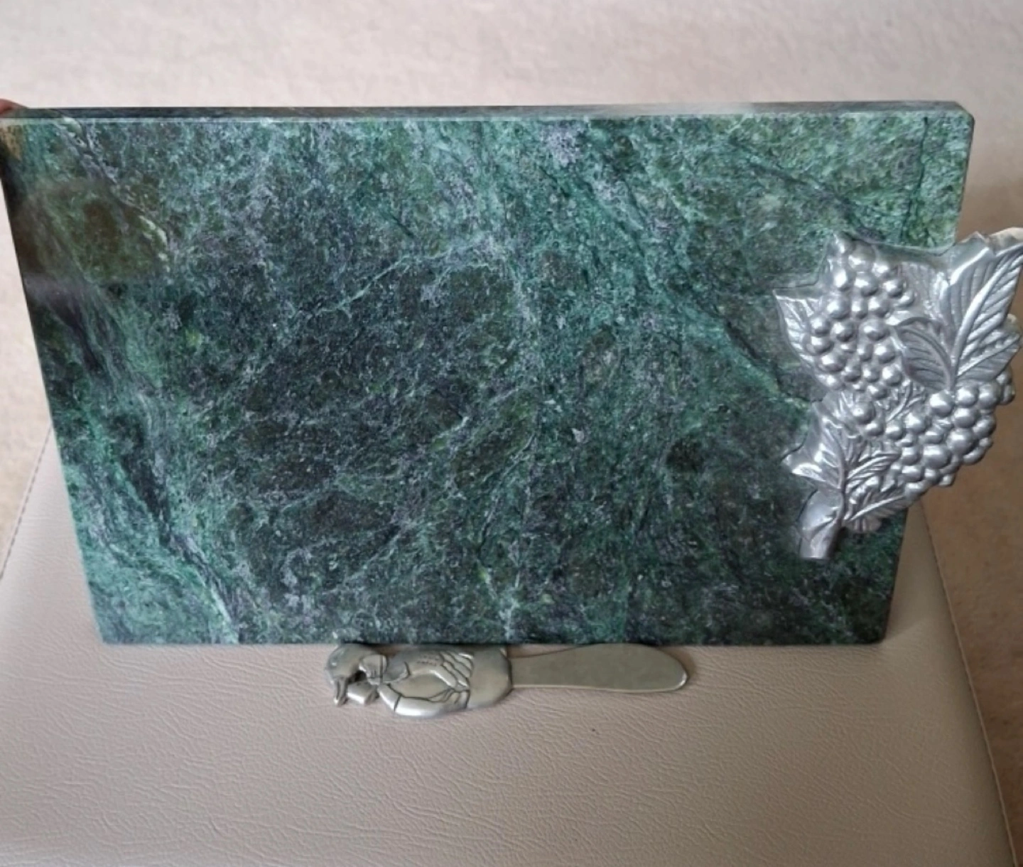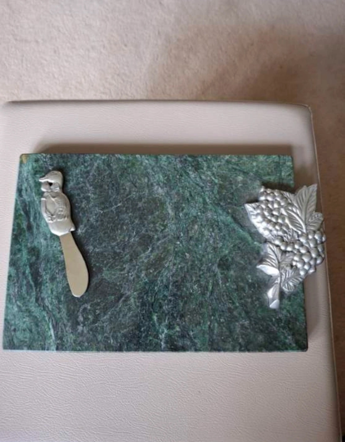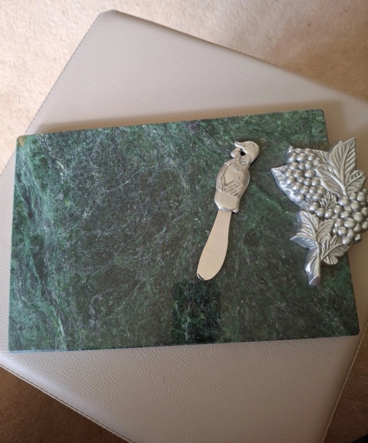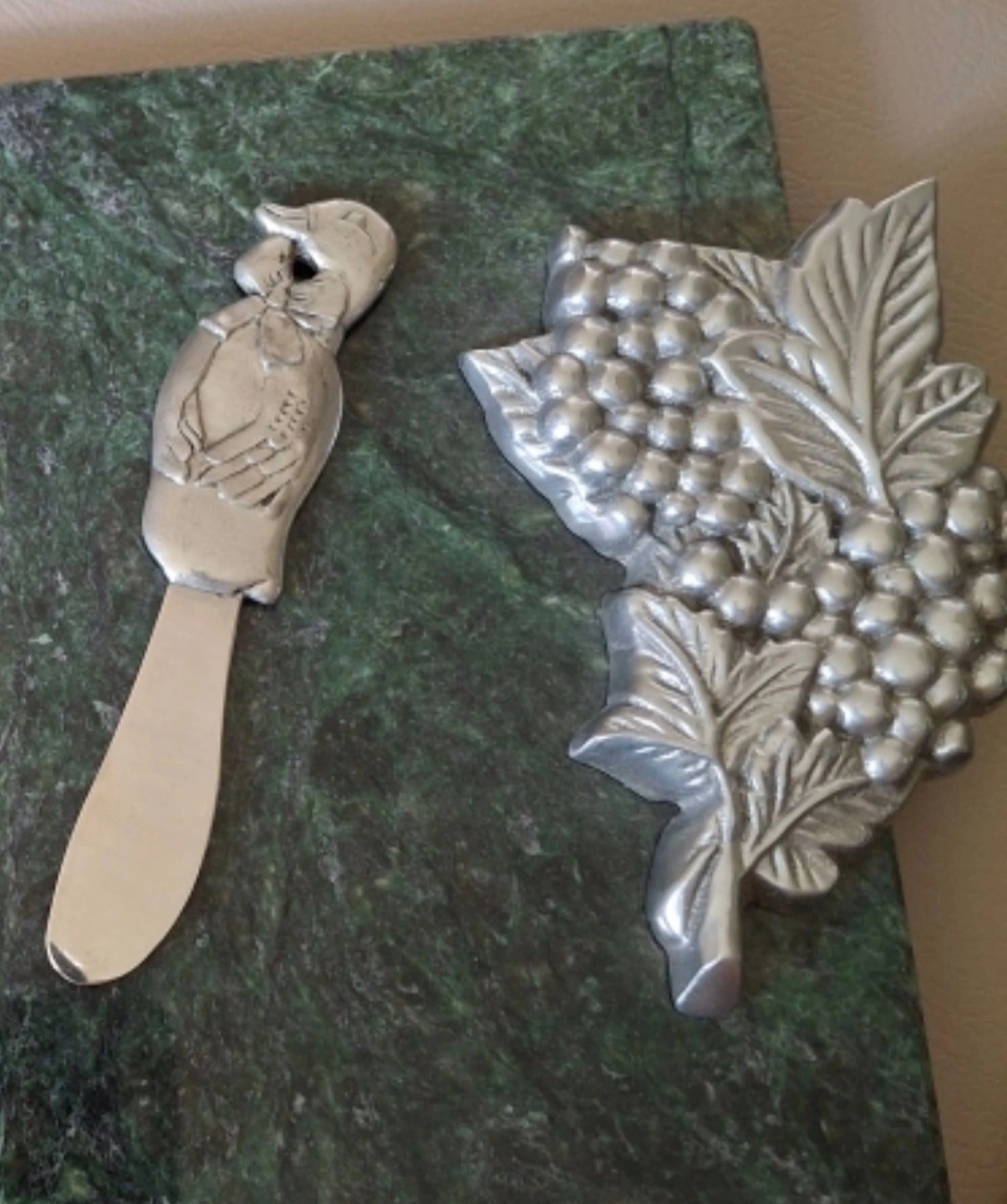 Vintage Seagull Pewter green marble cheese tray with grape and leaf pewter handle. Comes with a duck-themed pewter spreader. 11.5” by 8”. Other online listings have it for $39+. Selling for $7 Available for pickup in Markland Wood.