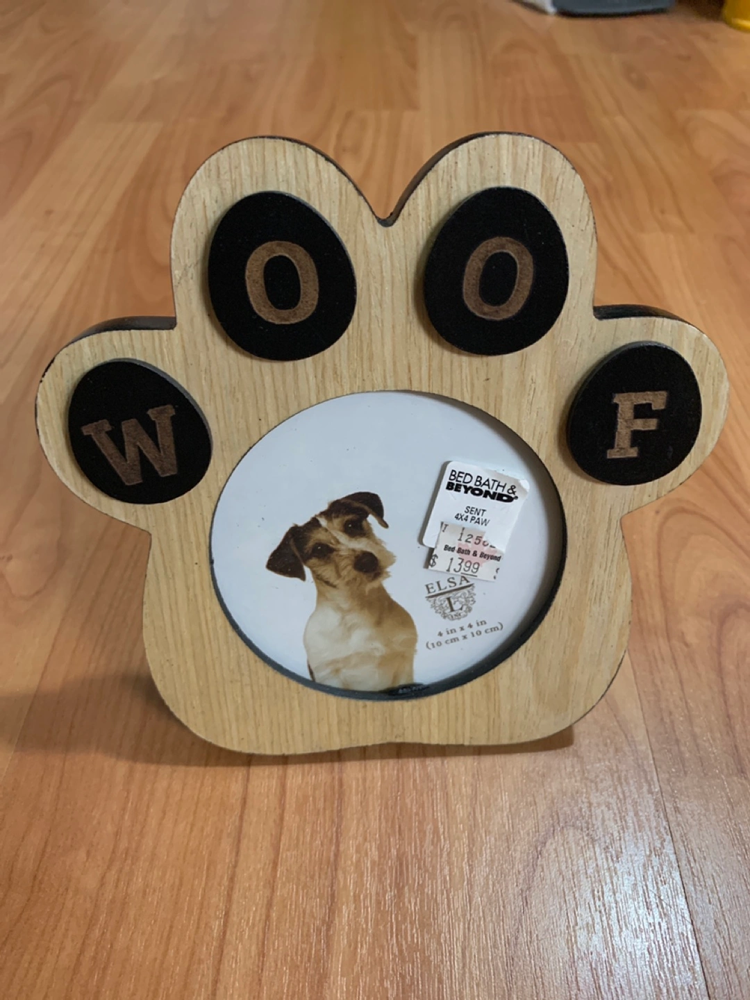 Adorable wooden photo frame shaped like a dog paw. Features black felt letters spelling "WOOF". Holds a 4x4 inch photo. Good condition, never used, glass sits a little loose porch pickup near erin mills town center