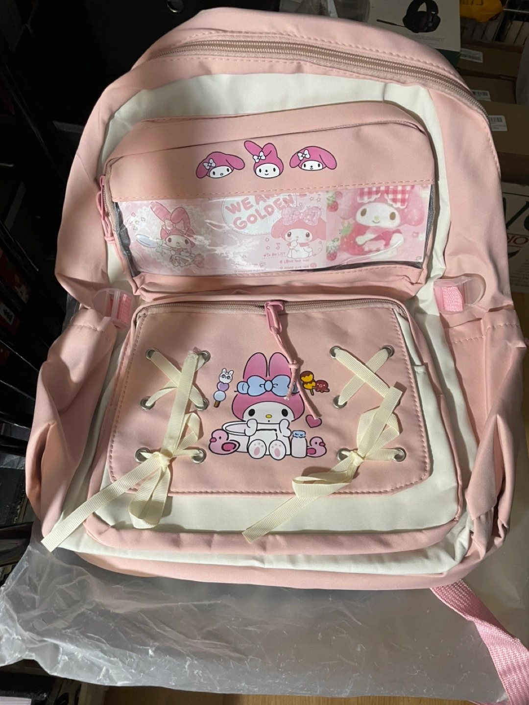Pink My Melody backpack. Features multiple compartments and cute design elements. Perfect for school or everyday use.