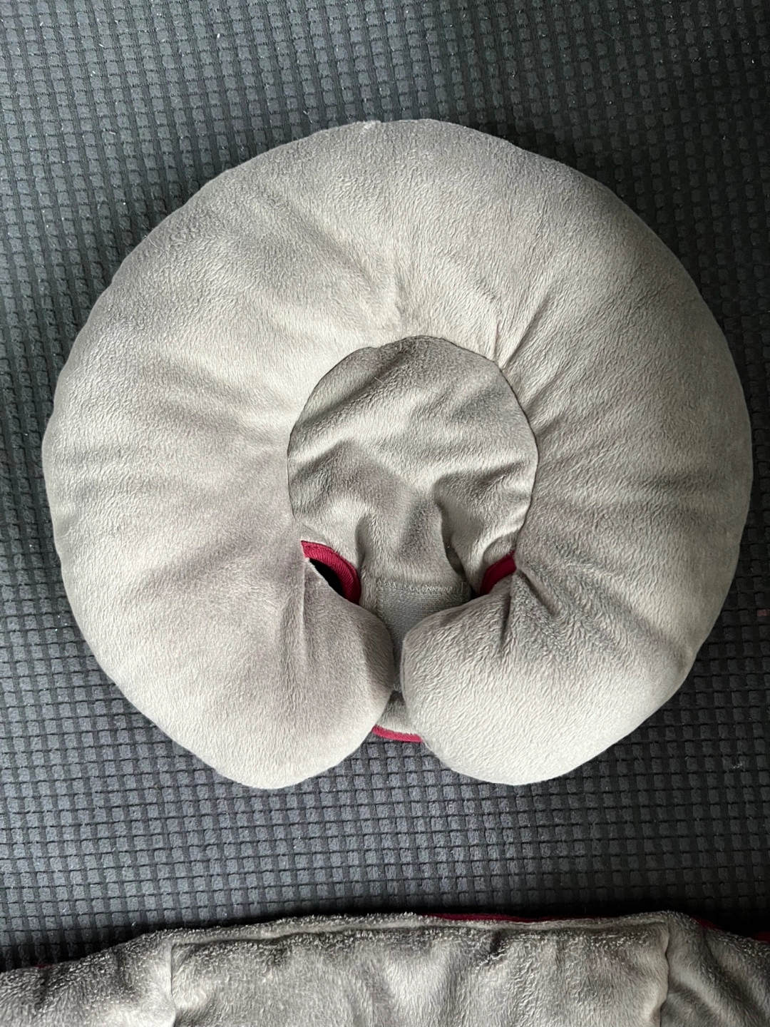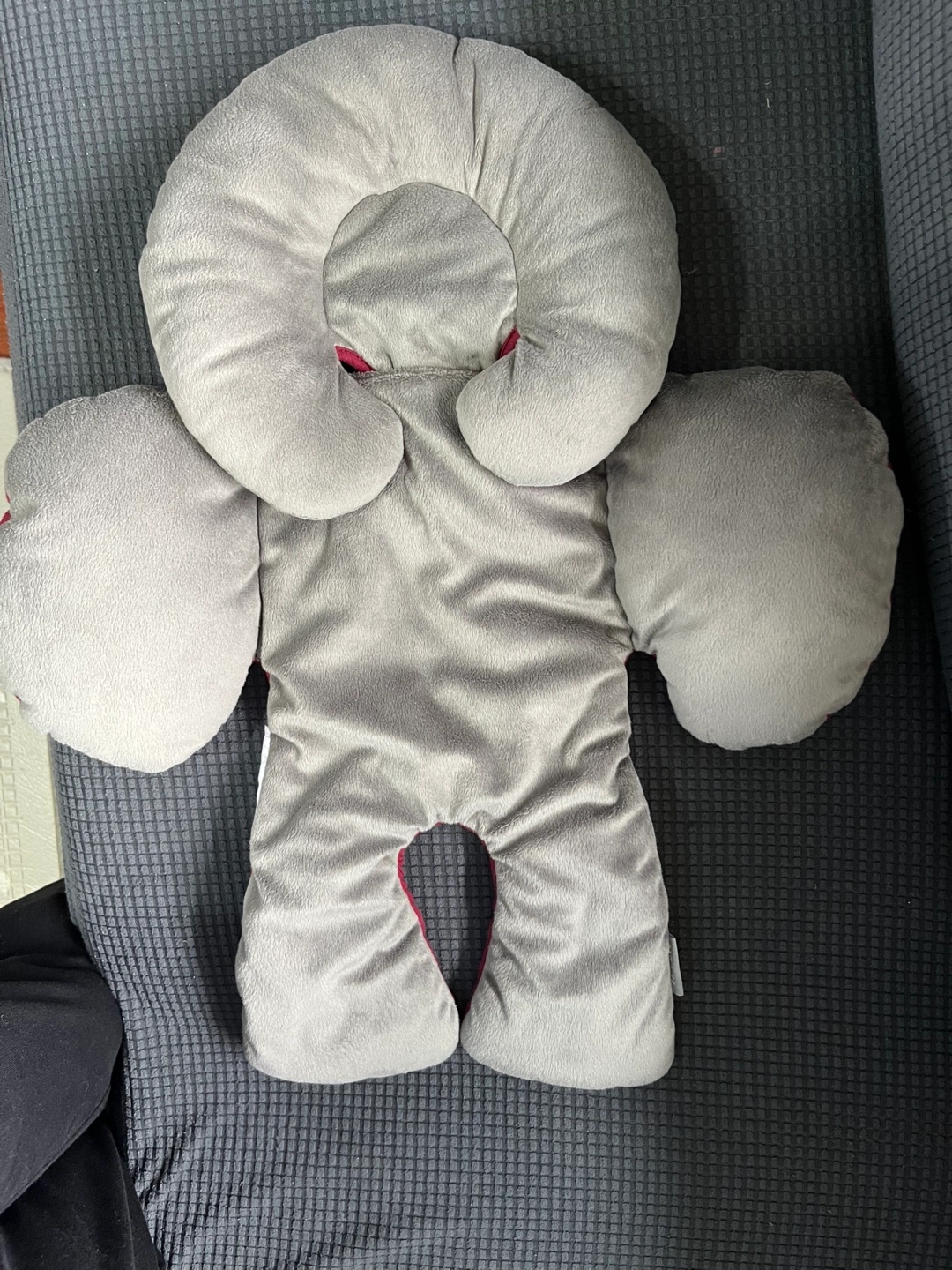 Plush baby car seat insert. Features head support and side bolsters. Grey and burgundy colour scheme. Only tried it at home but we end up not using it. Its already wash and ready to use.
