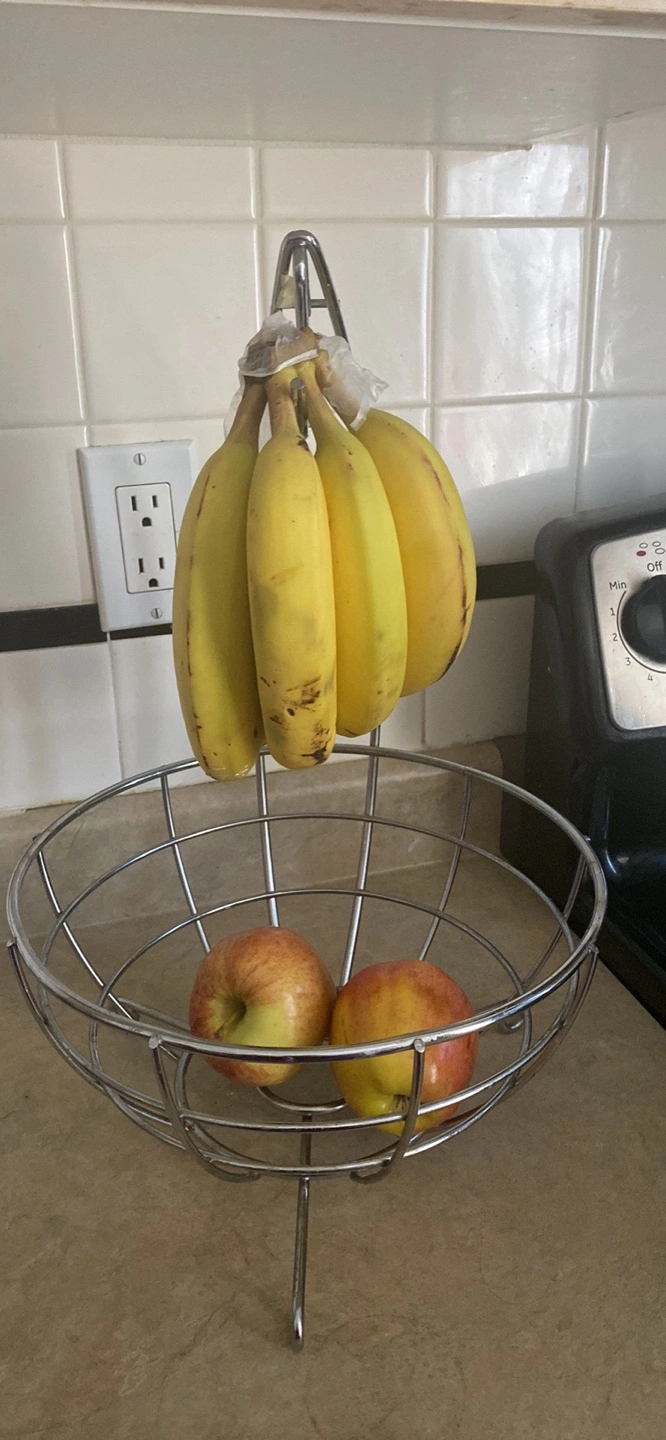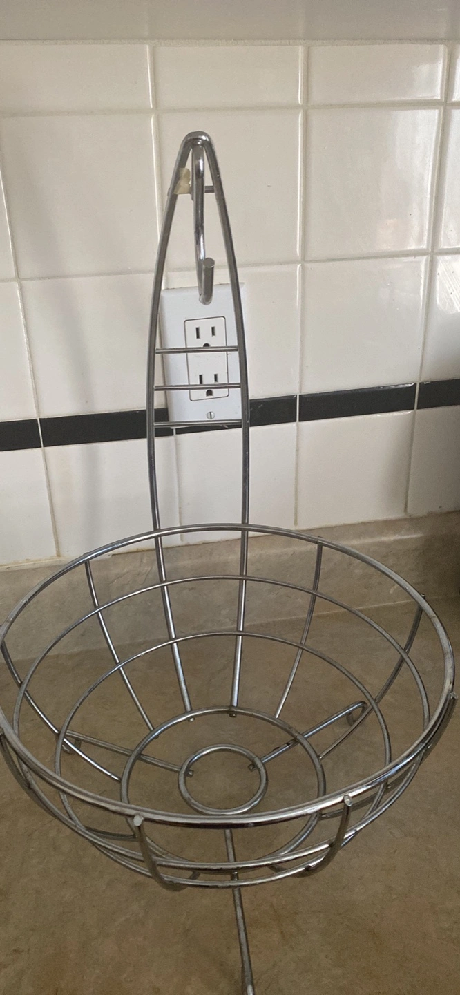 Metal fruit bowl. Holds fruit and features a banana hanger. Great for kitchens and countertops. Chrome finish.