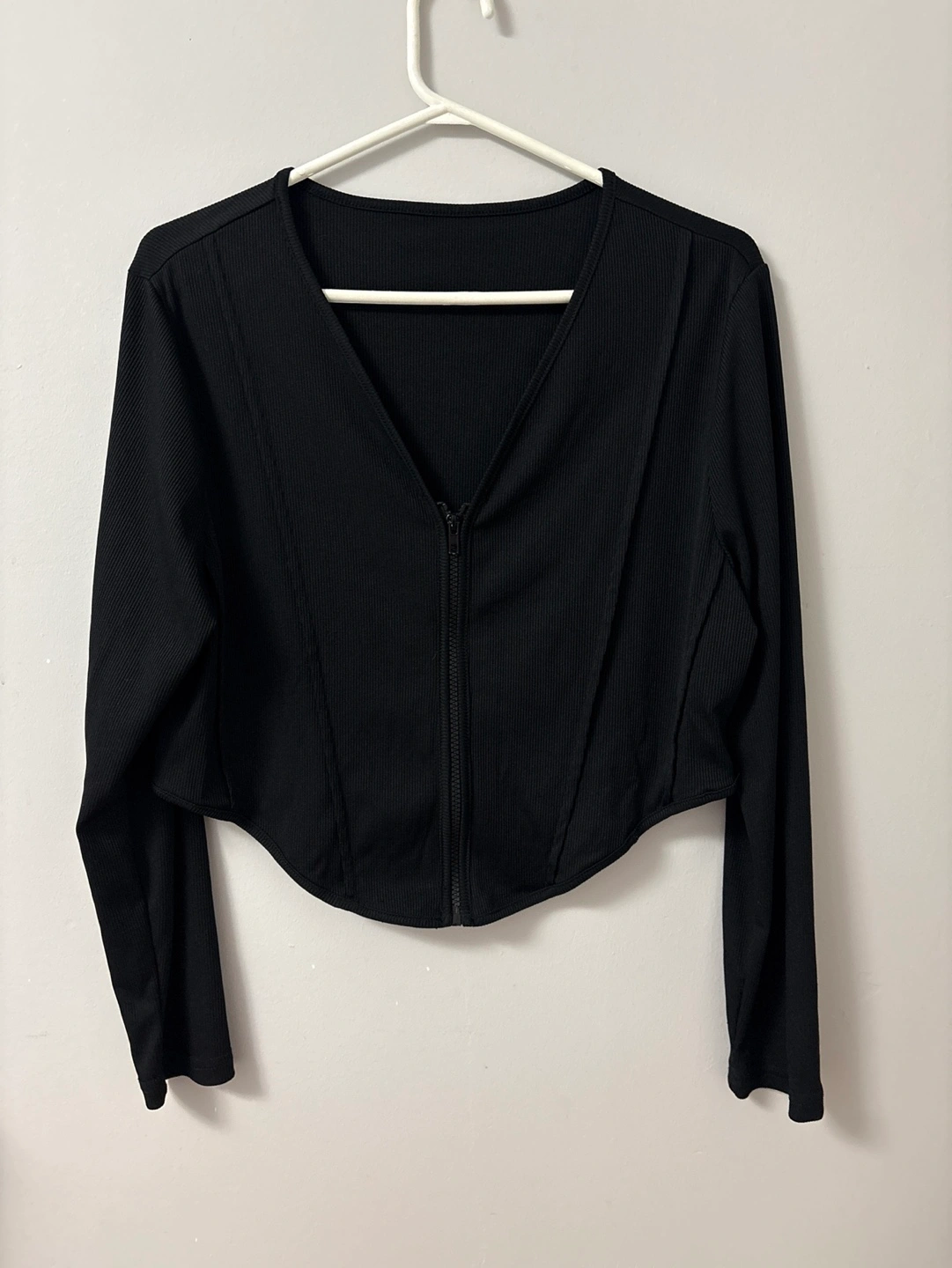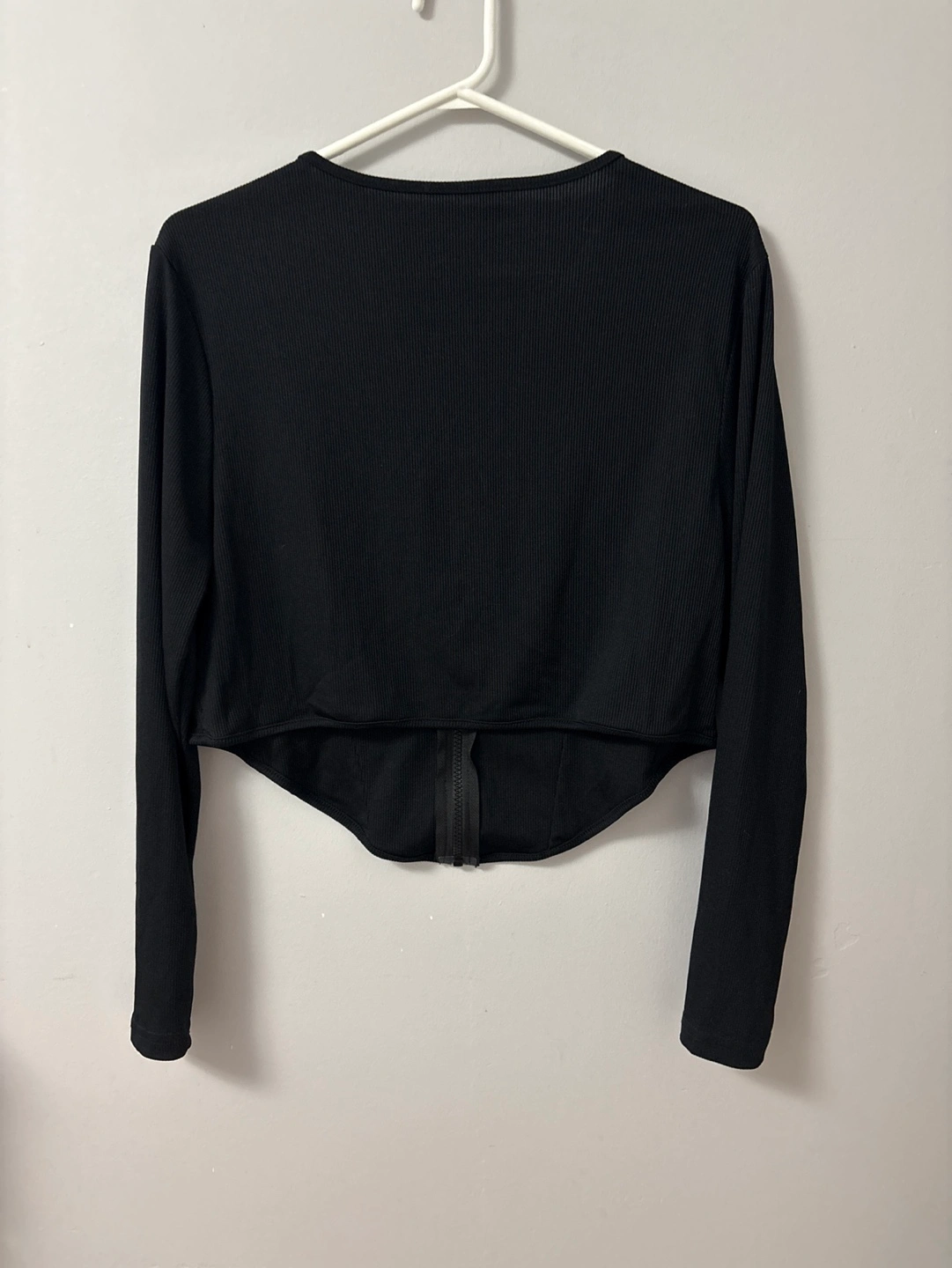 Pick up only Long sleeve cropped top. Black ribbed fabric. Features a front zipper. Great for layering or wearing alone.