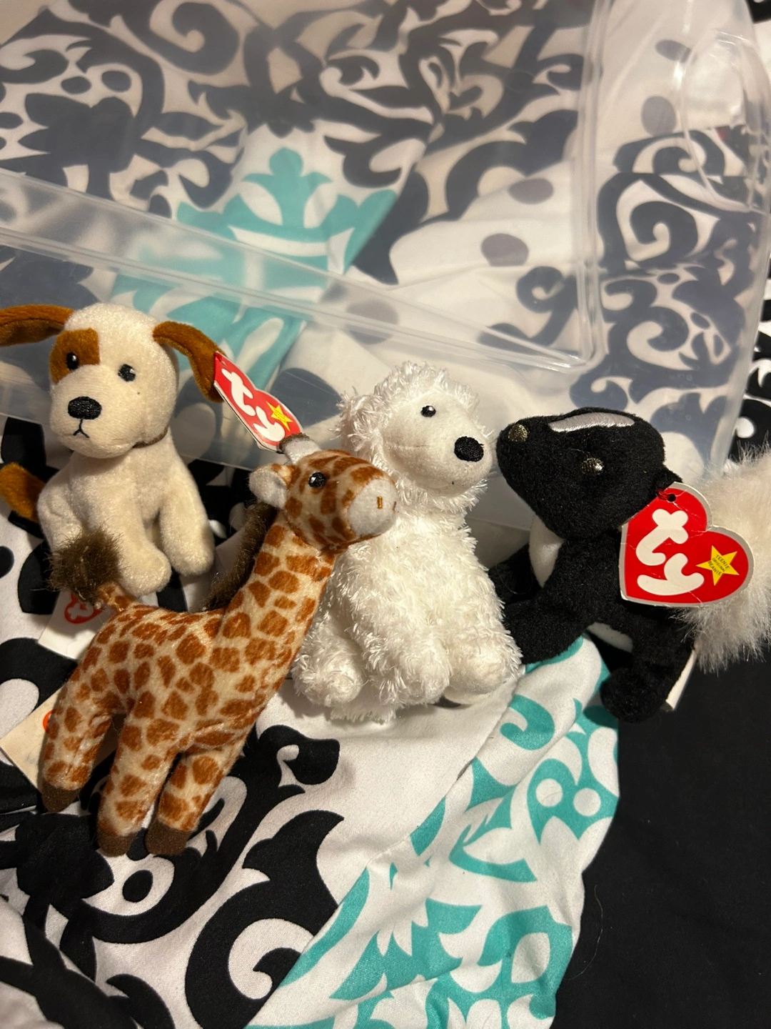Four miniature Ty Beanie Babies. Includes a dog, poodle, giraffe, and skunk. Collectible plush toys. 🎀Bundle items for discounts when purchasing more then one item🎀