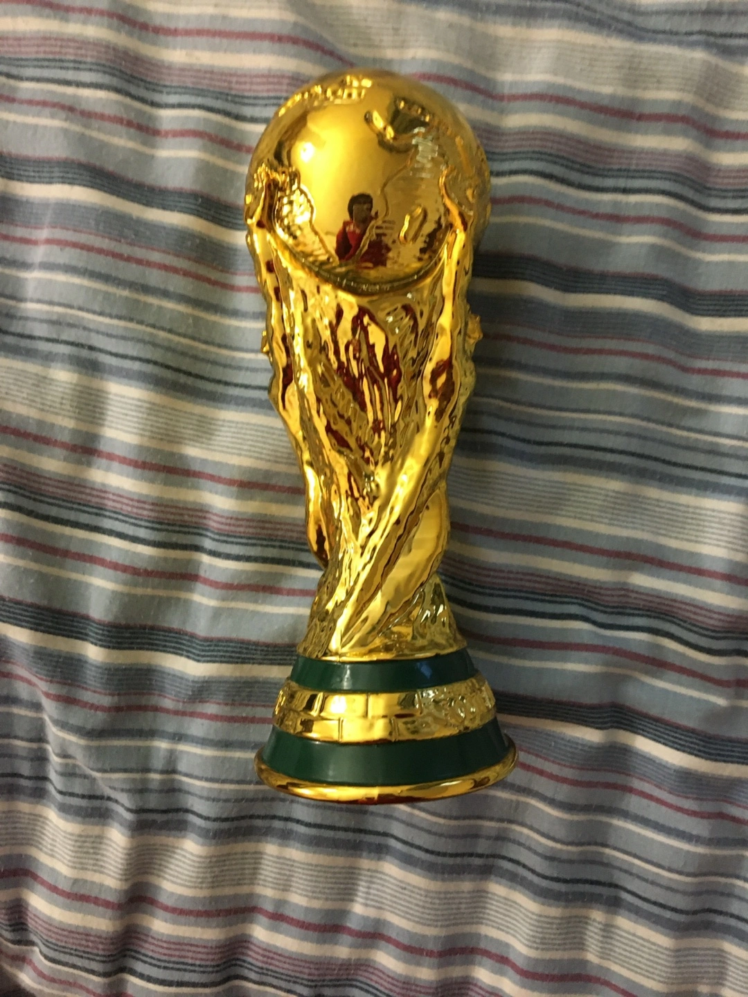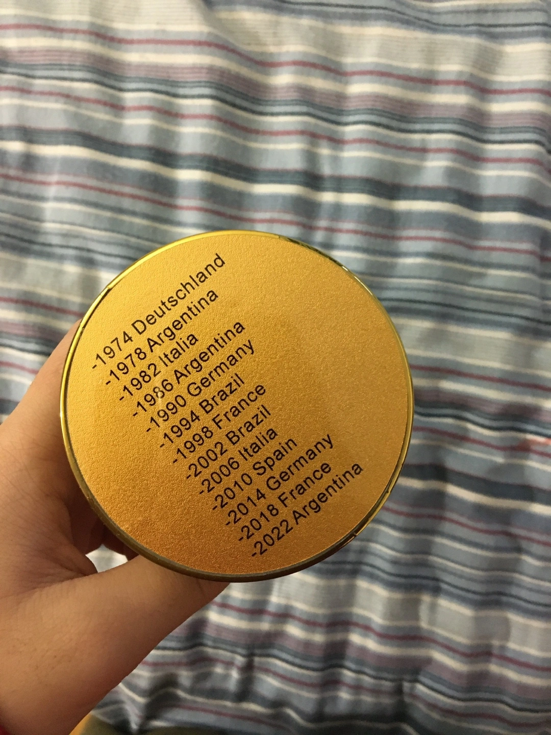 Gold-coloured replica of the FIFA World Cup trophy. Features engraved winners from 1974-2022. Collectible item. Great for fans.