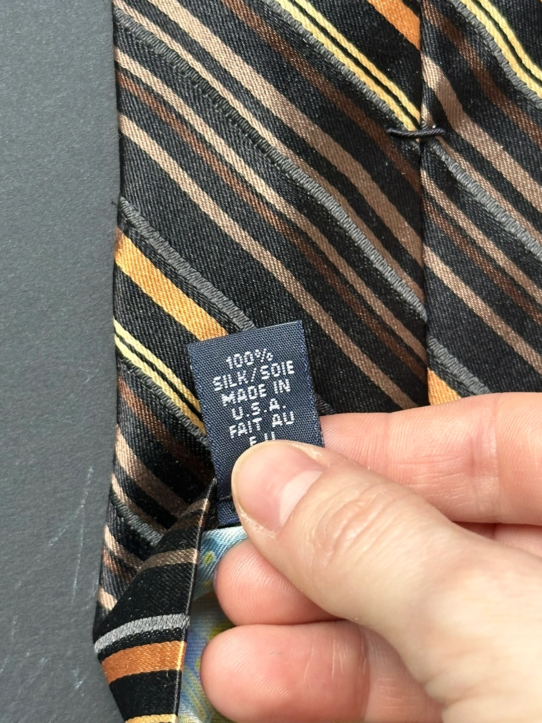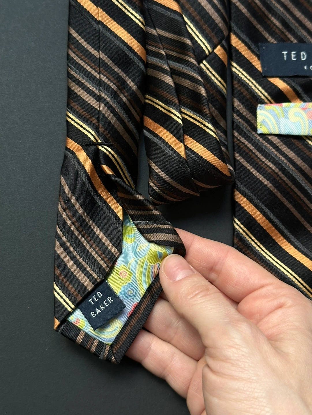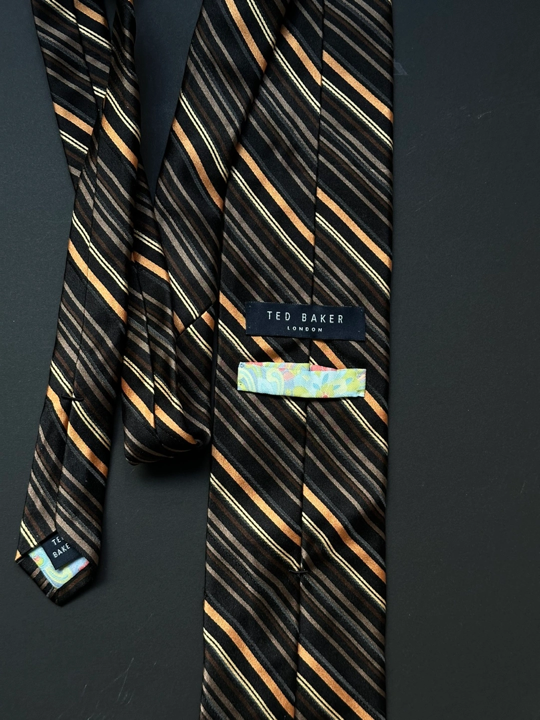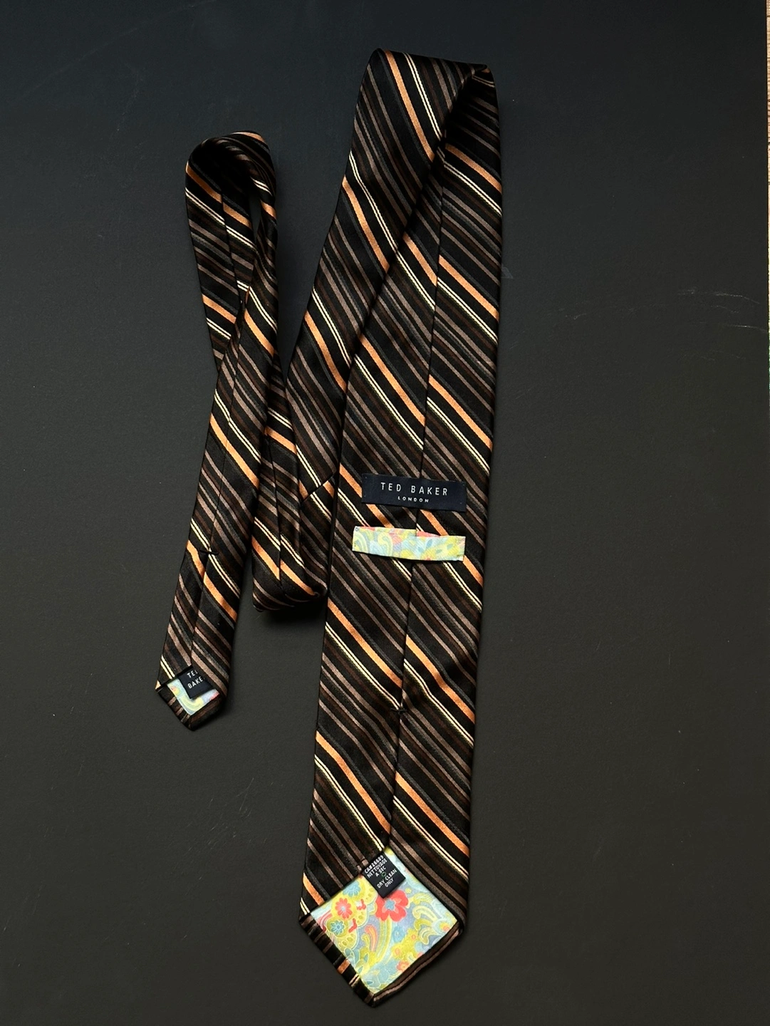 Men’s Ted Baker Tie 100% Silk Striped Print Shell. This tie is pre-owned and in like-new condition. It is 58” long from the Blade to the Tail. The Tipping has a Floral Abstract design and the Blade is 3.5” wide. Pick up near Yonge & Bloor