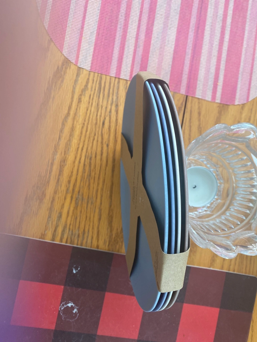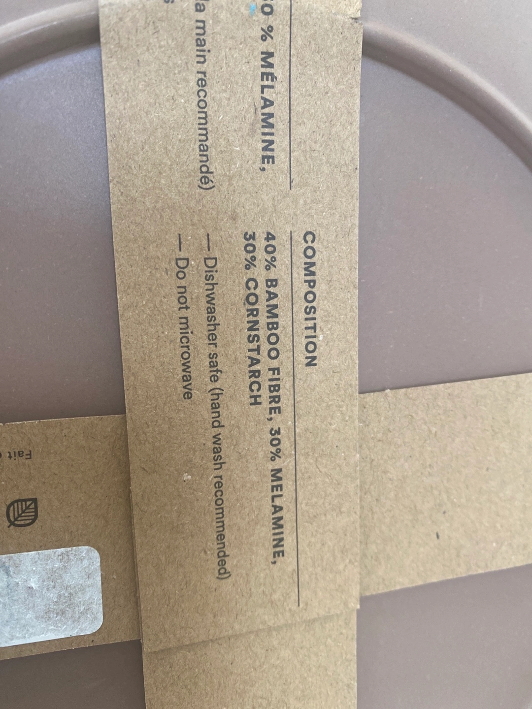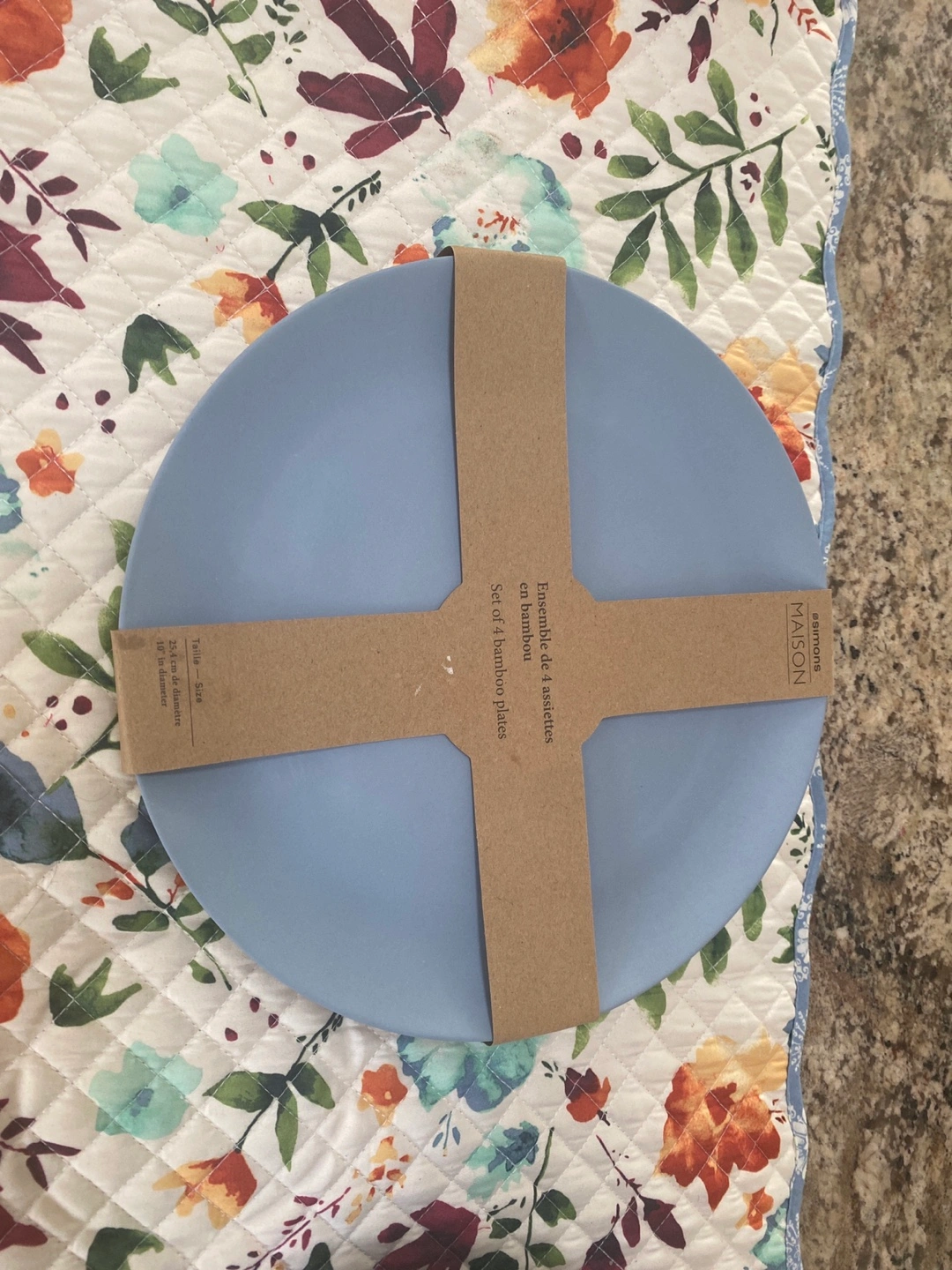 Set of four beautiful and durable bamboo plates. Dishwasher and hand-wash safe. Made of 40% bamboo fibre, 30% cornstarch, and 30% melamine. Do not microwave.