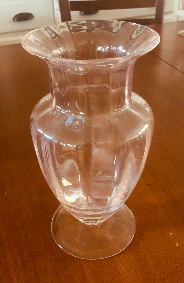 Pink glass vase. Features a flared top and a pedestal base. Perfect for floral arrangements or home décor.