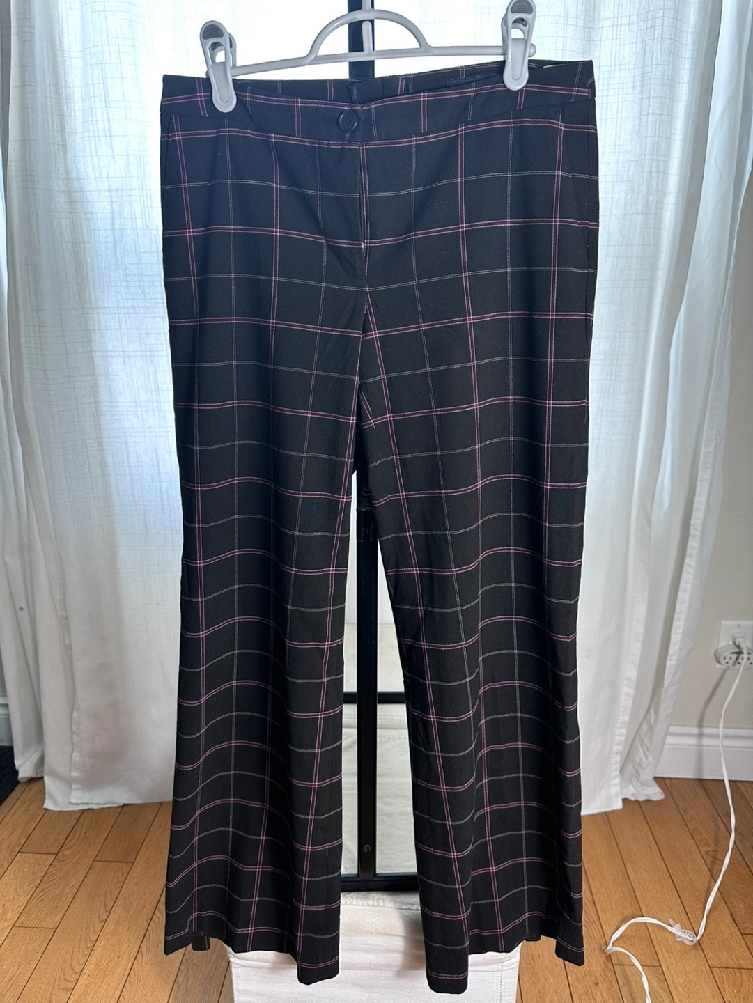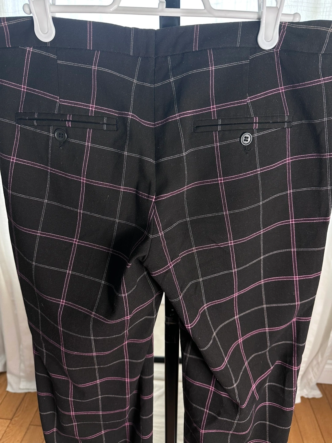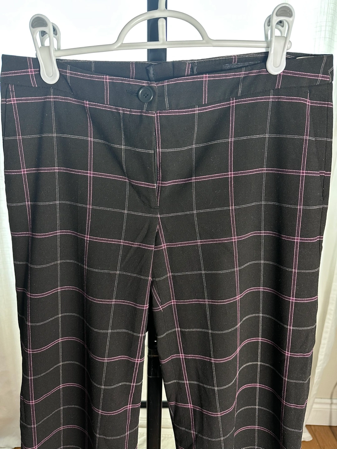 Women's trousers, black with pink and white plaid pattern. Size US 6, EUR 36. Made in Turkey. Straight wide leg style. Button and zipper closure.