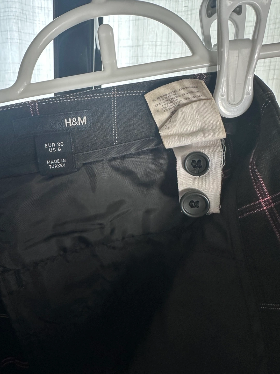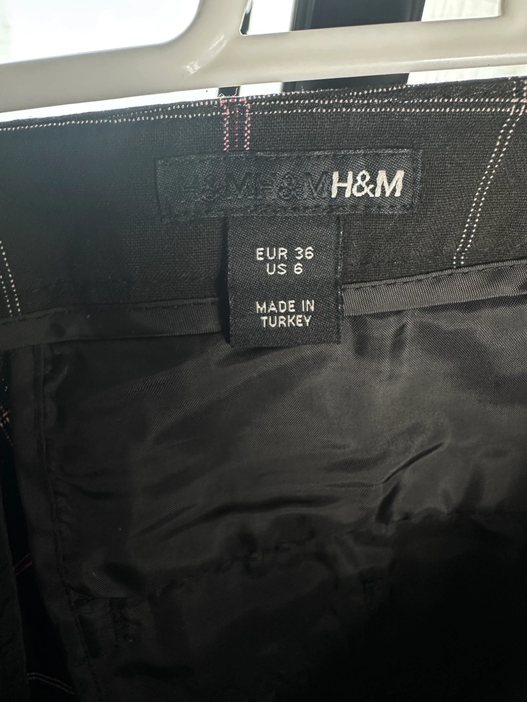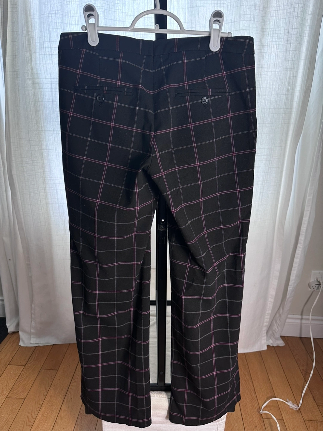 Women's trousers, black with pink and white plaid pattern. Size US 6, EUR 36. Made in Turkey. Straight wide leg style. Button and zipper closure.