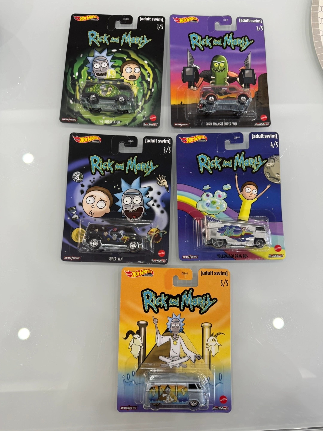 FULL SET OF 5 CARS MINT CONDITION DIECAST METAL BODY AND CHASIS REAL RIDERS TIRES 1. ‘66 DODGE A100 2. FORD TRANSIT SUPERVAN 3. SUPERVAN 4. VOLKSWAGEN DRAG BUS 5. VOLKSWAGEN T1 PANEL BUS