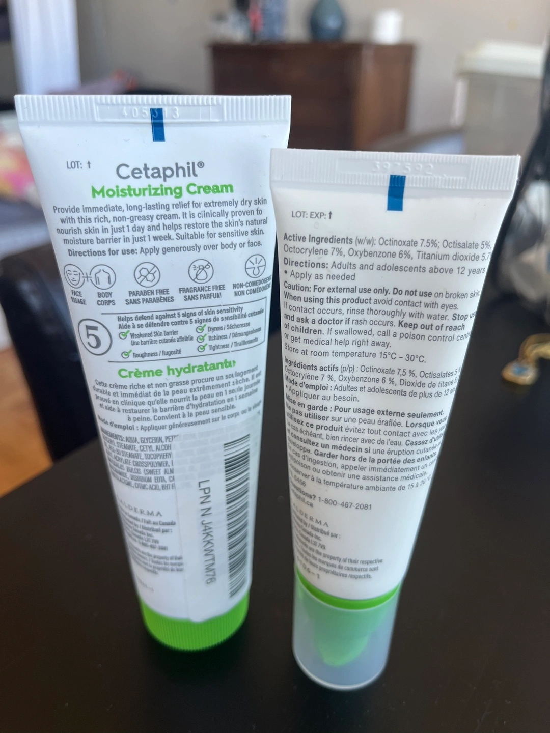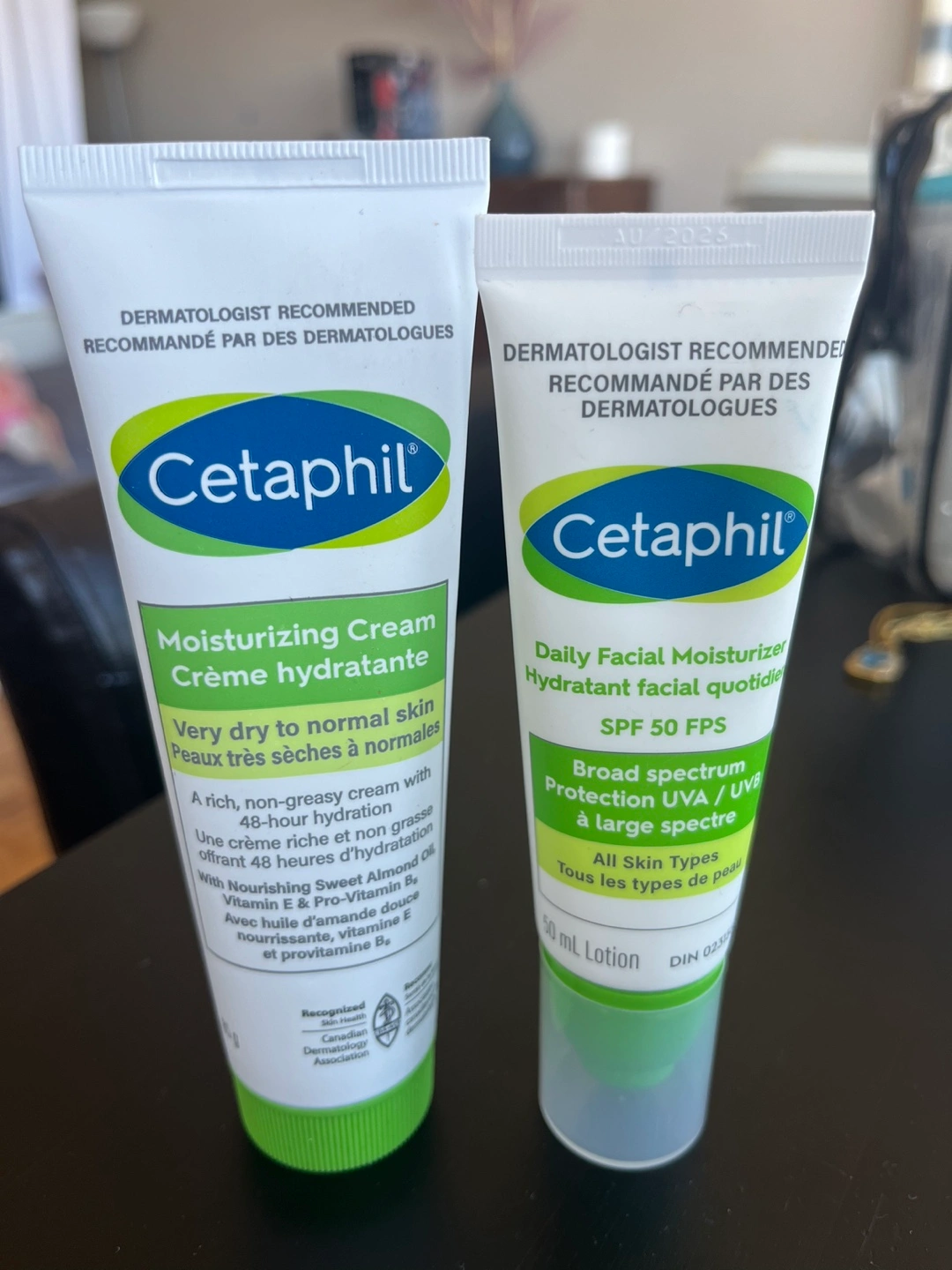 Two Cetaphil tubes. One moisturizing cream for very dry to normal skin. One daily facial moisturizer with SPF 50. Dermatologist recommended.