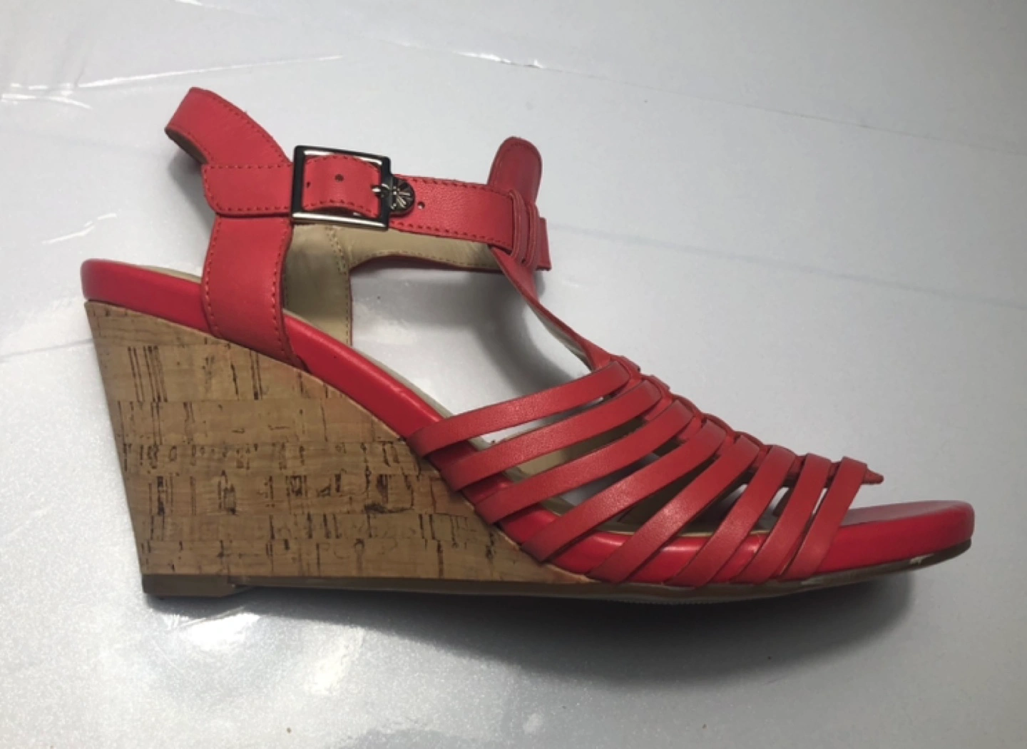 Coral coloured stroppy leather sandals. Wedge heel 3.5”. Ankle strap with buckle closure. Woven design. Open toe. Super comfortable thanks to padded insole and cork wedge heel. Brand new without tags.