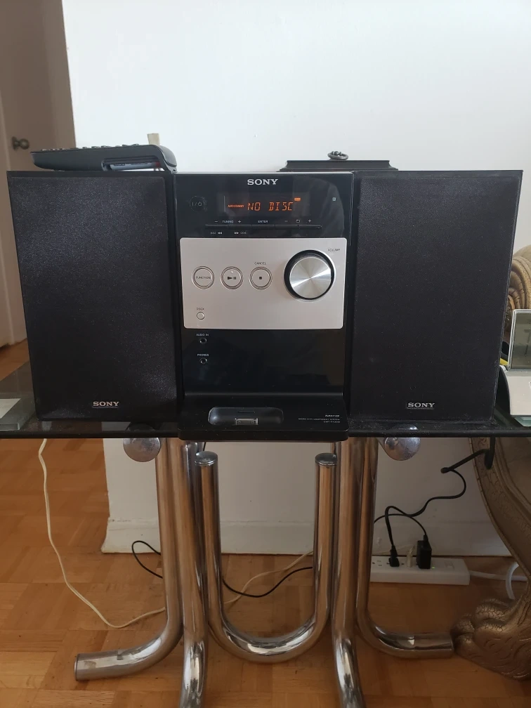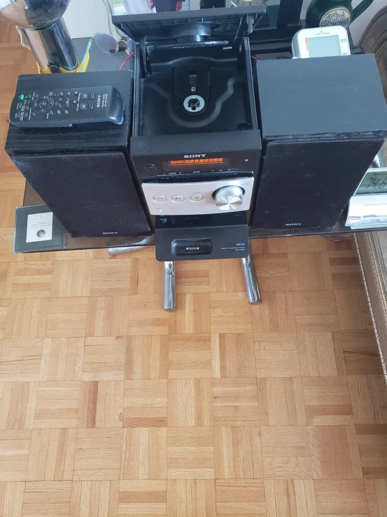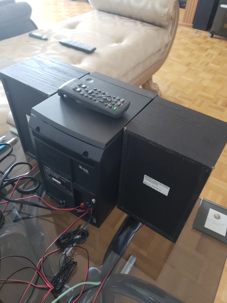 Compact stereo system. Includes CD player, radio tuner, and USB input. Two speakers and remote control. Good condition. includes MP3.