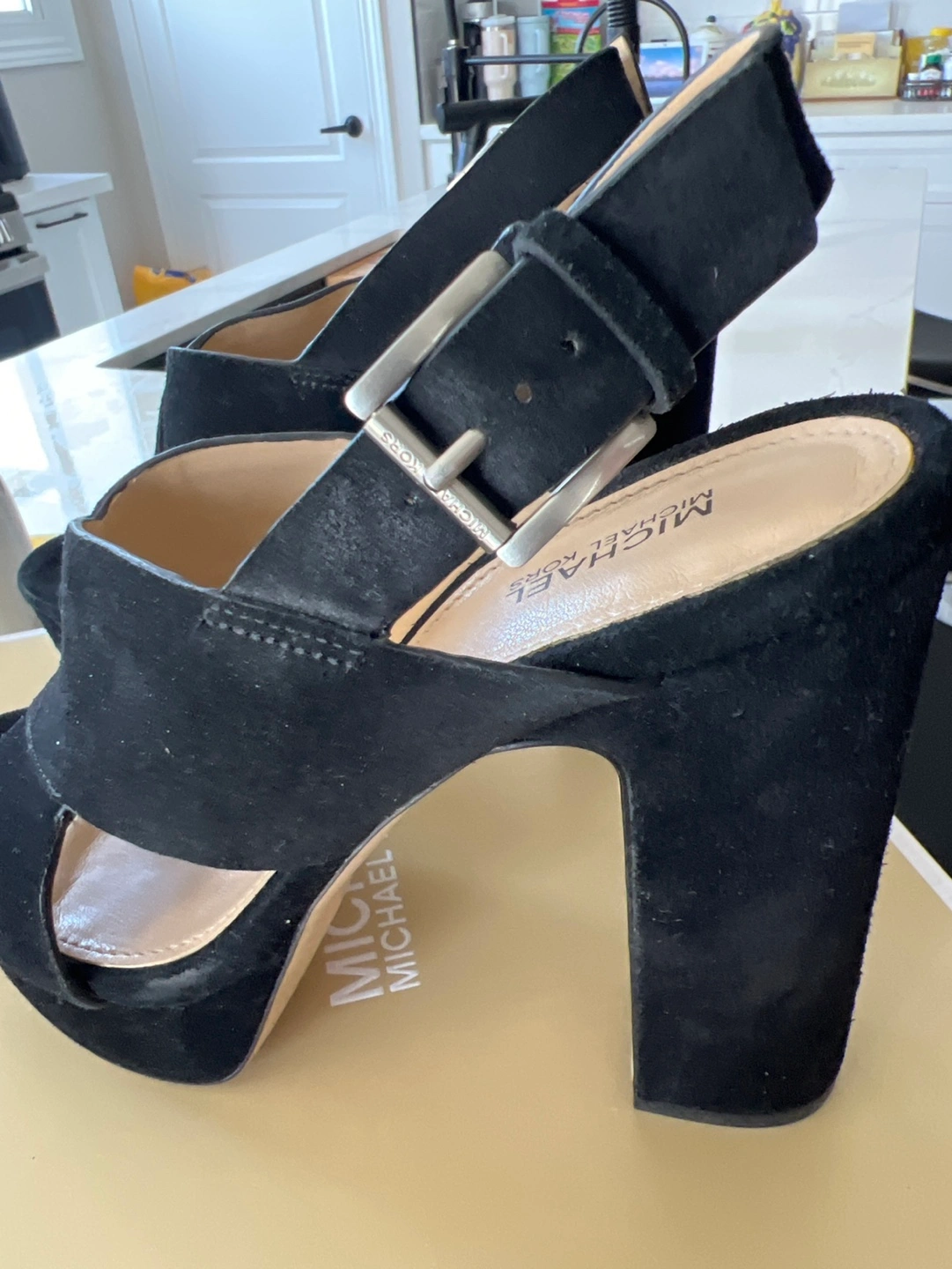Women's black suede platform heels. Ankle strap with buckle closure. Open toe design. Excellent condition, comes with original box. Worn once