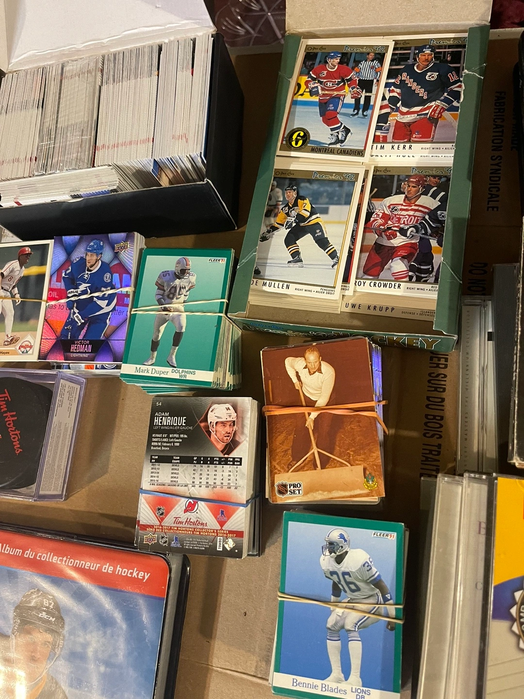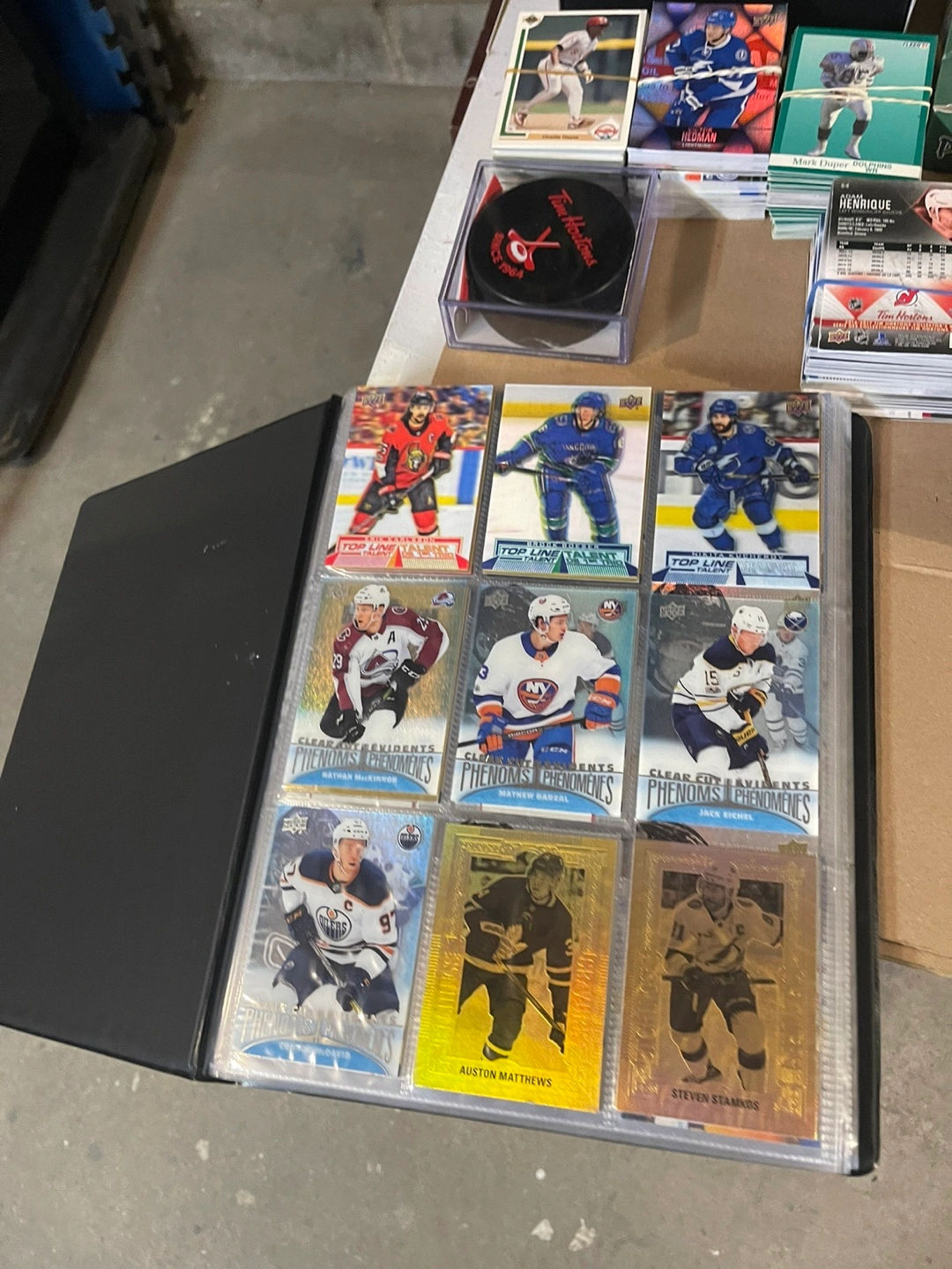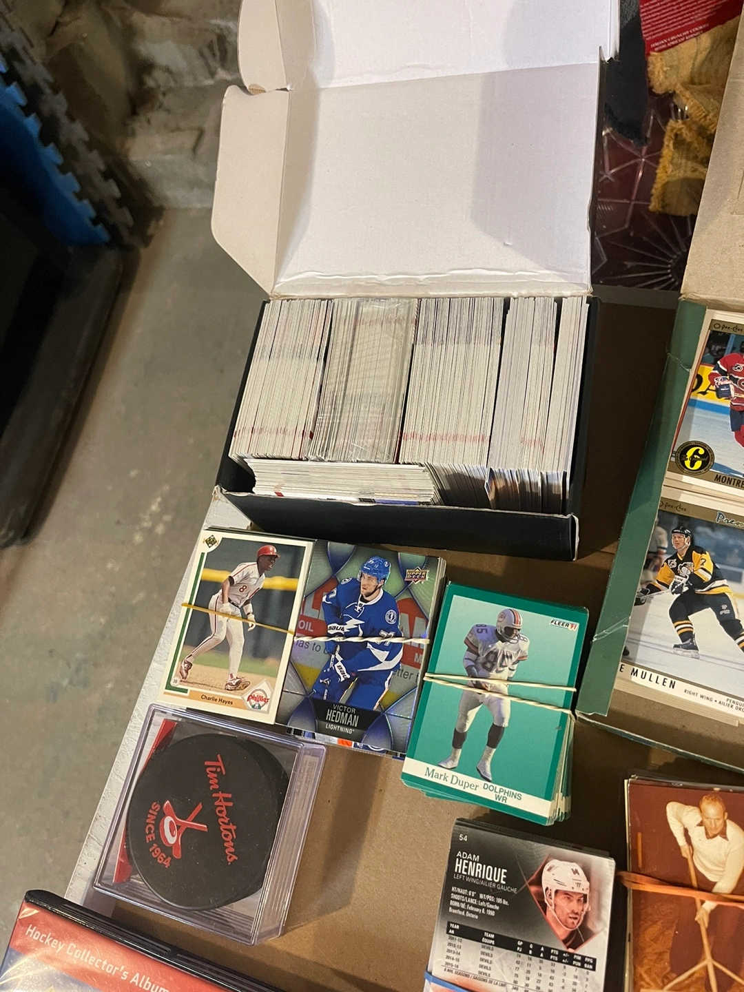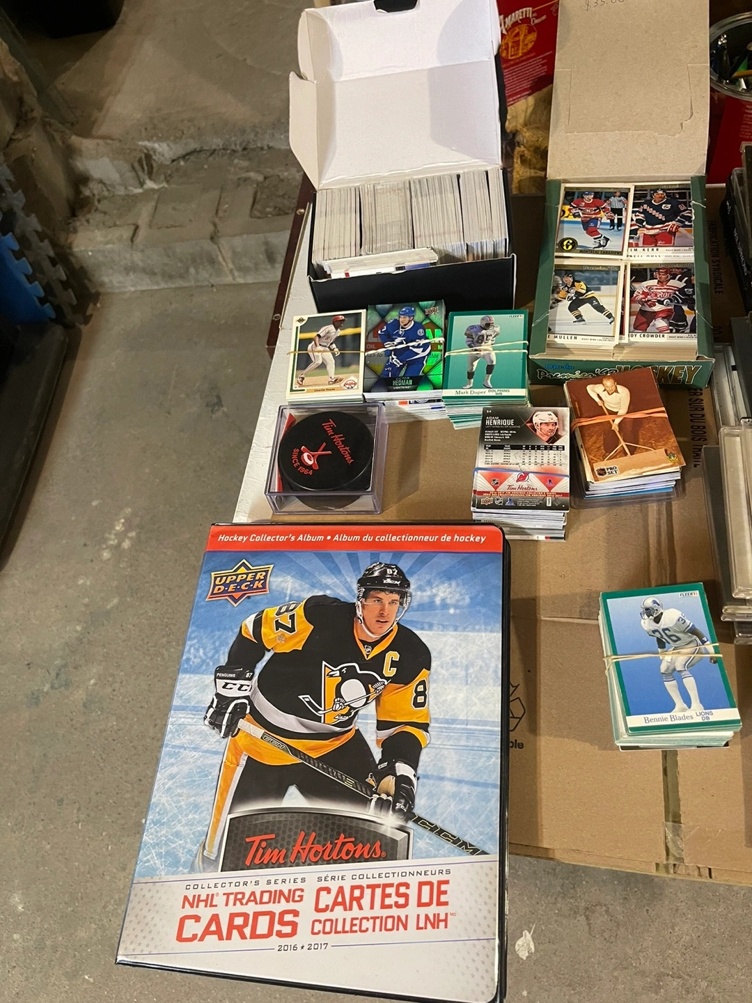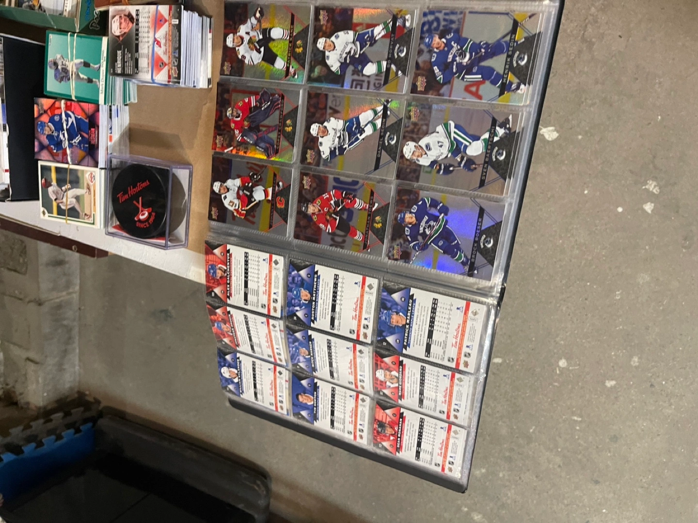 Large collection of hockey cards, including several unopened boxes. Many cards in a Tim Hortons binder. Includes a Tim Hortons puck. Various brands and years represented.