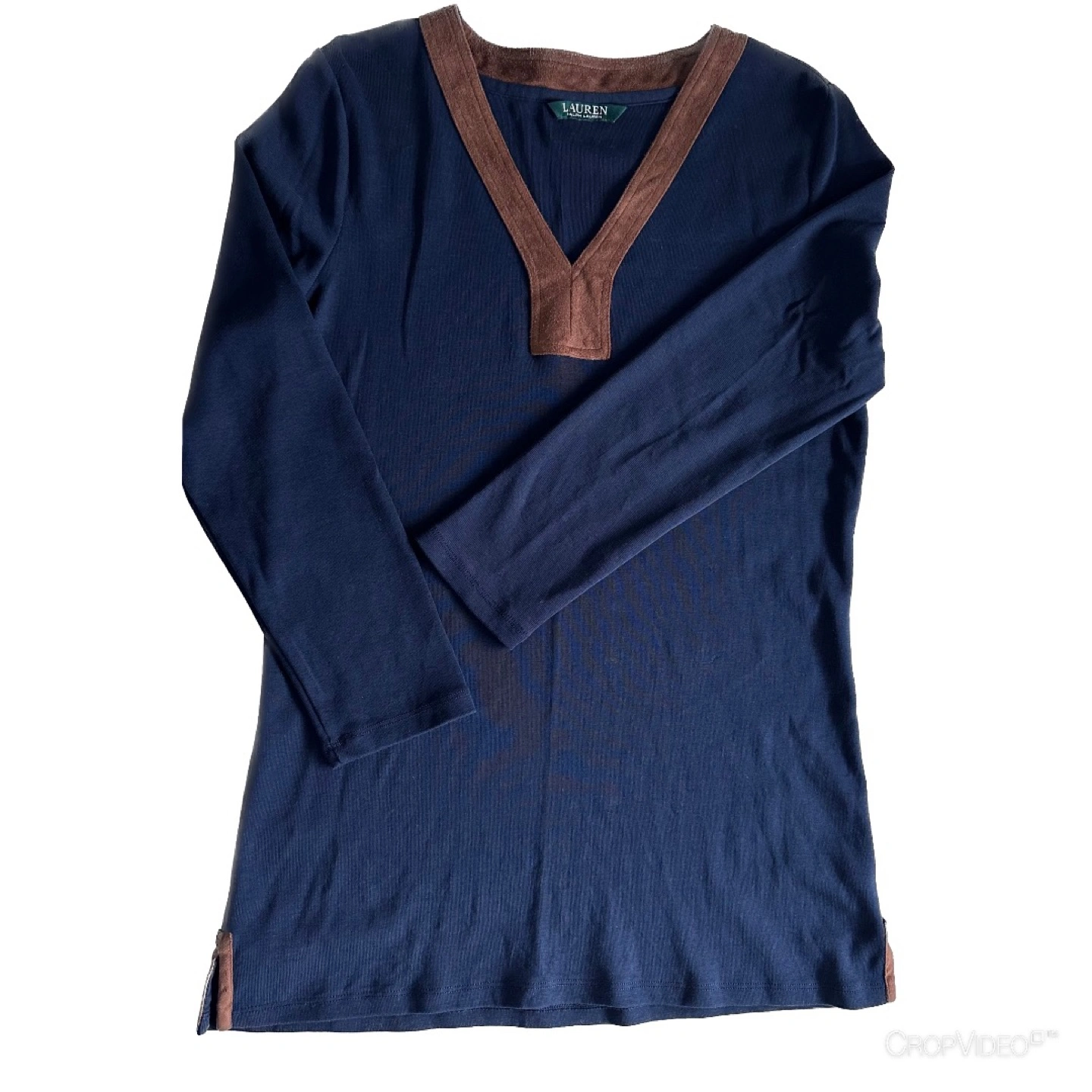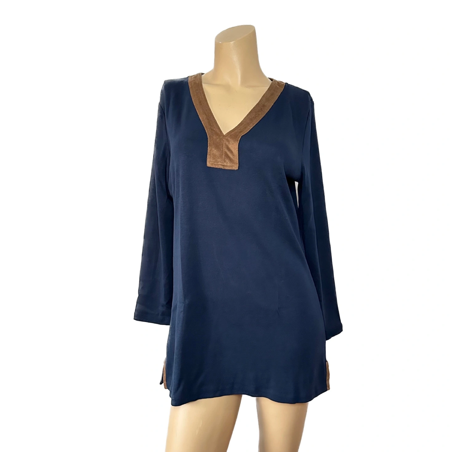 Long sleeve navy blue tunic. Brown suede-like detail at neckline and slits. Three-quarter length sleeves. V-neck. Size : Medium Style : Boho Fit : Regular Armpit to armpit : 18.5 inch Length from center back : 29 inch Sleeve : 24 inch No hang tag