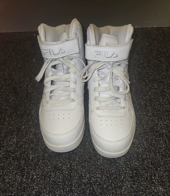 Women's Fila high-top sneakers. White leather-like material. Velcro strap and laces. Size 7 1/2 US. Like New Condition. * Cash Only * * No E-transfers * * Pickup Only * * Serious Offers Only *