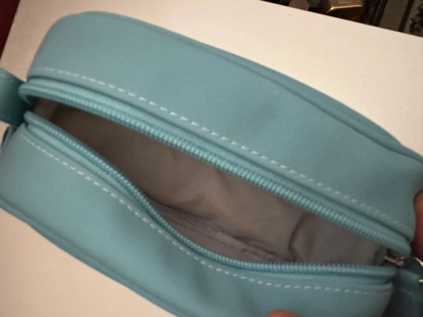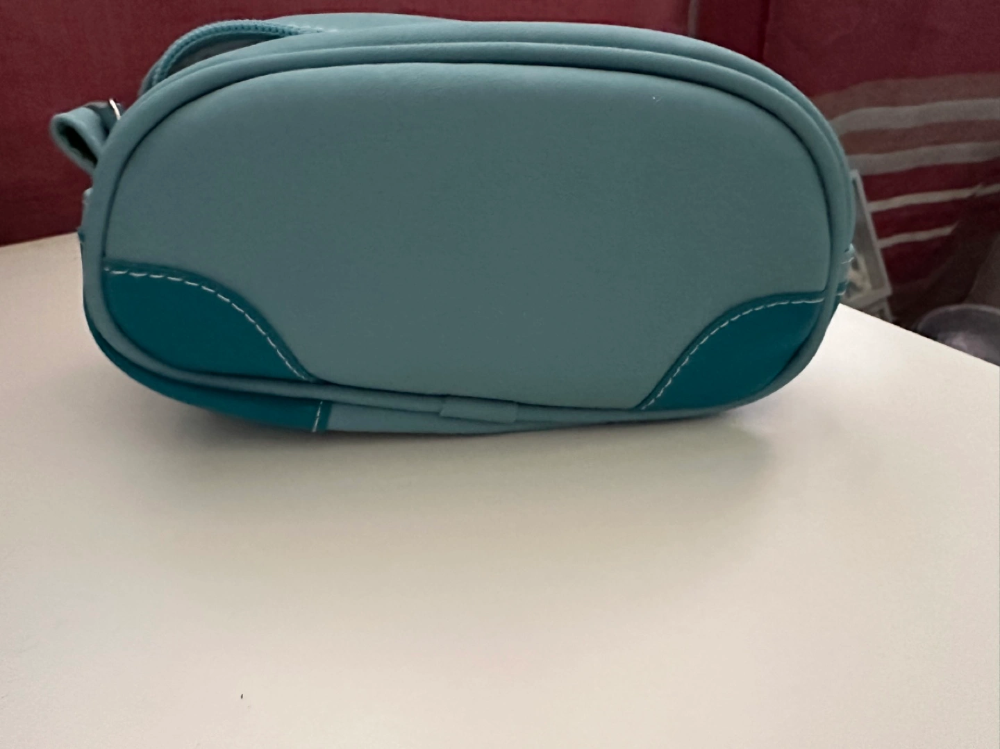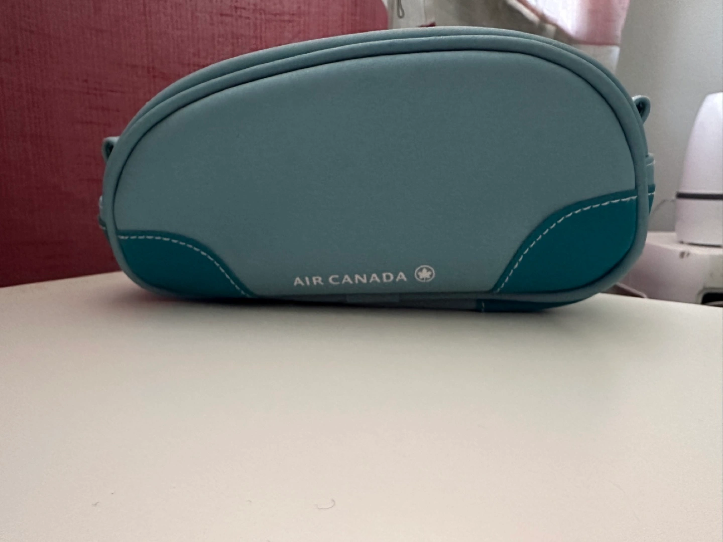 Pale blue zippered travel case. Small and lightweight. Features teal accents and the Air Canada logo.