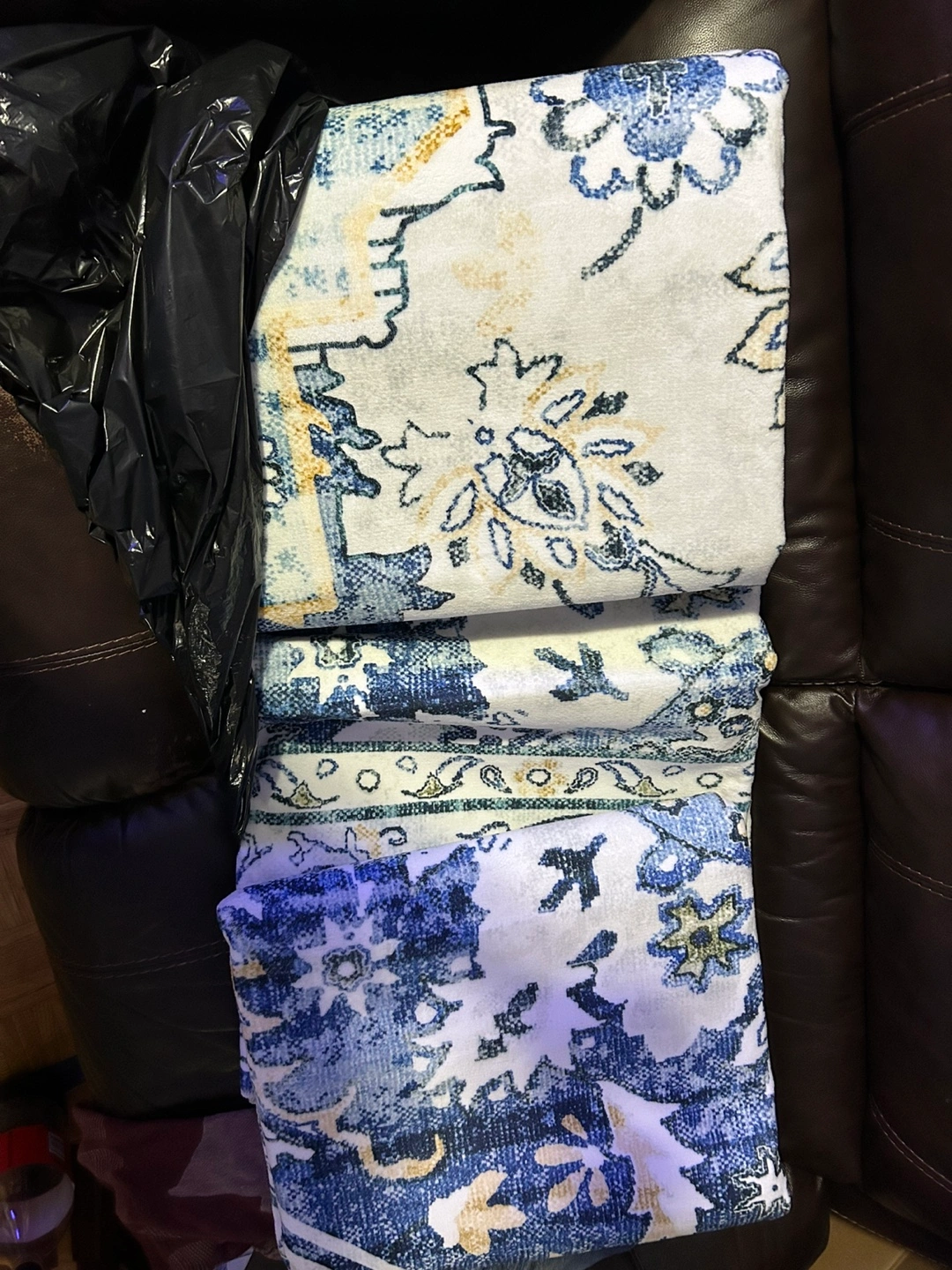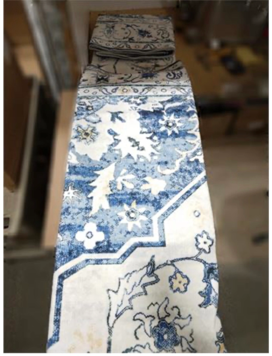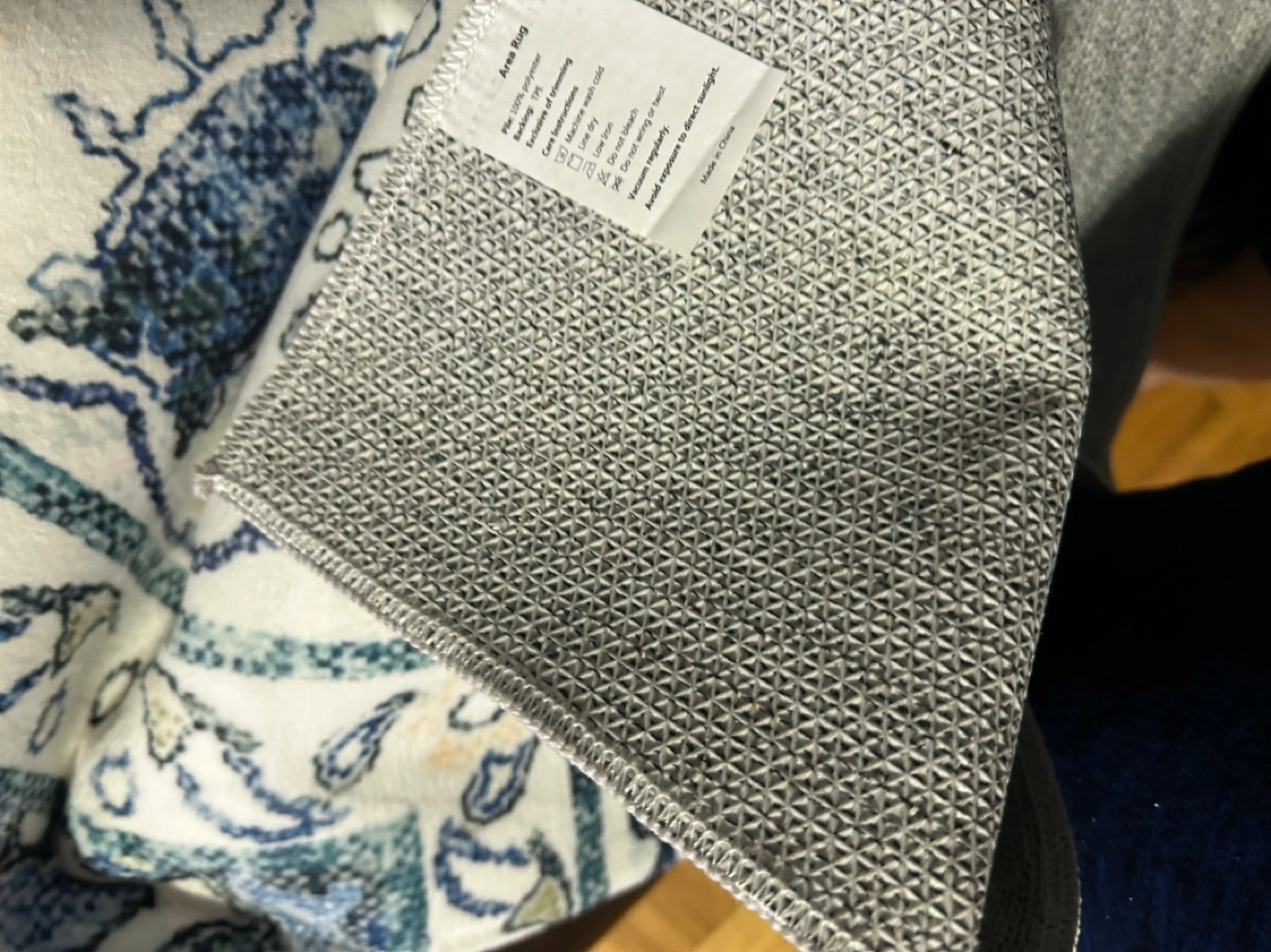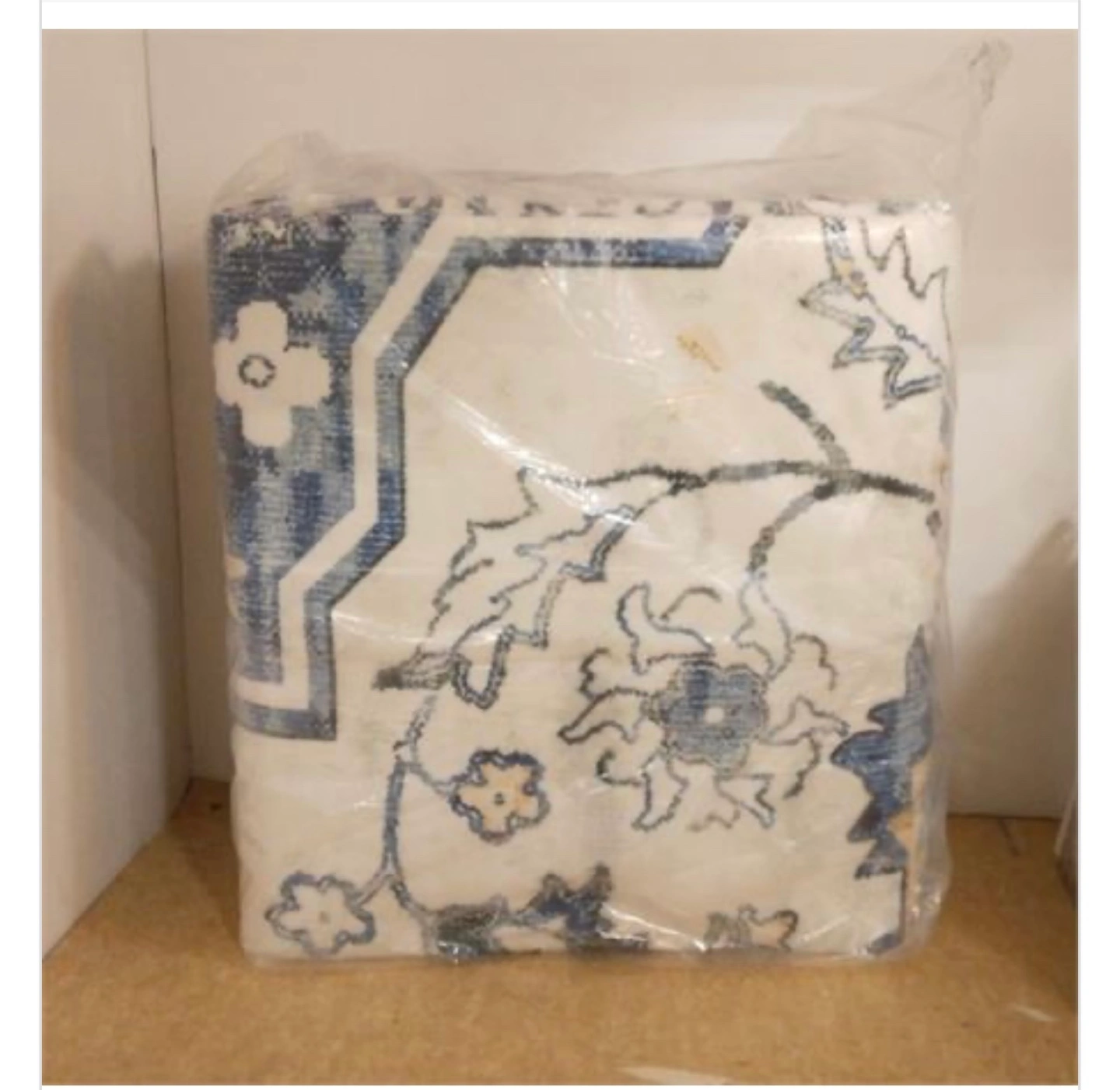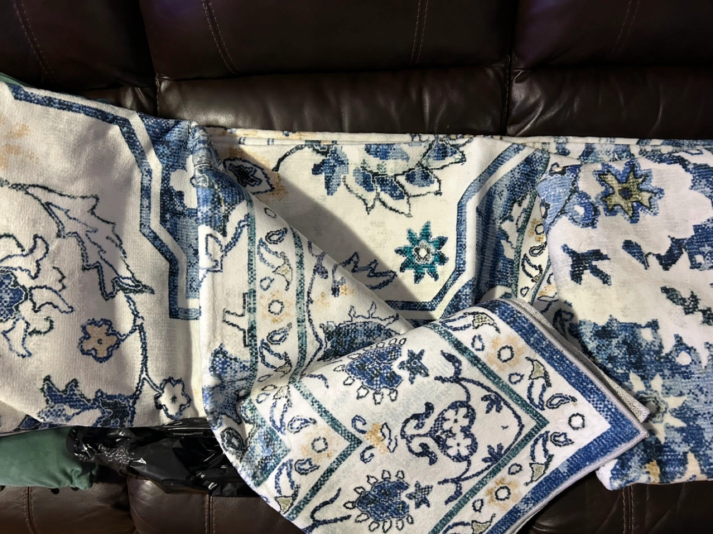Brand new 6ft by 12 ft Area Rug. Taken out of plastic to measure. Very pretty White and Blue Color Motif Low-Pile and very soft! 100% Polyester TPE Nonslip Backing Price FIRM. Leslie/Hwy 401