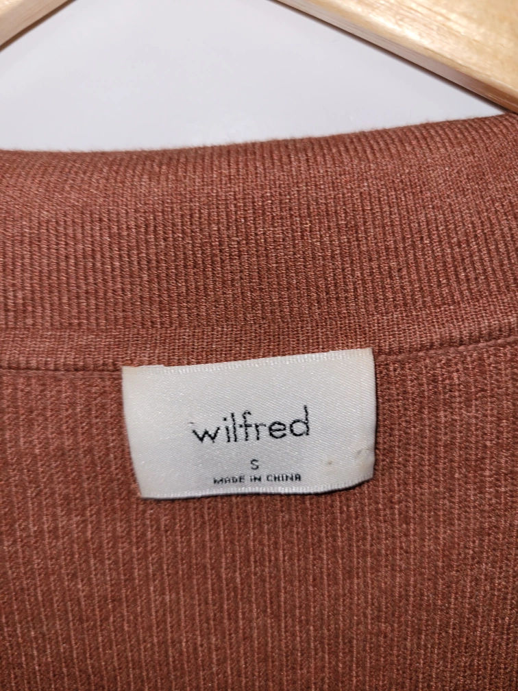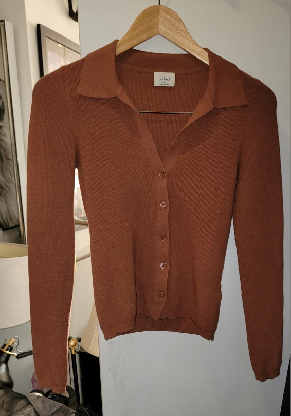 Beautiful rust-coloured ribbed knit cardigan. Size small. Long sleeves, collared neckline, button closure. Made in China. **** Cash Only **** **** Pickup Only **** **** No E-transfers **** **** Serious Inquiries Only ****