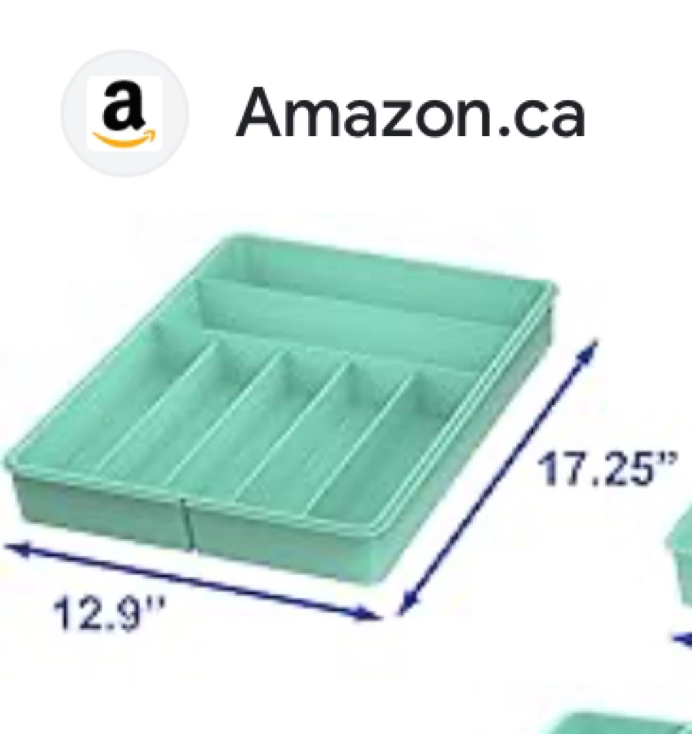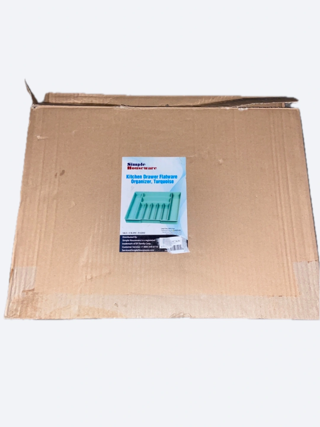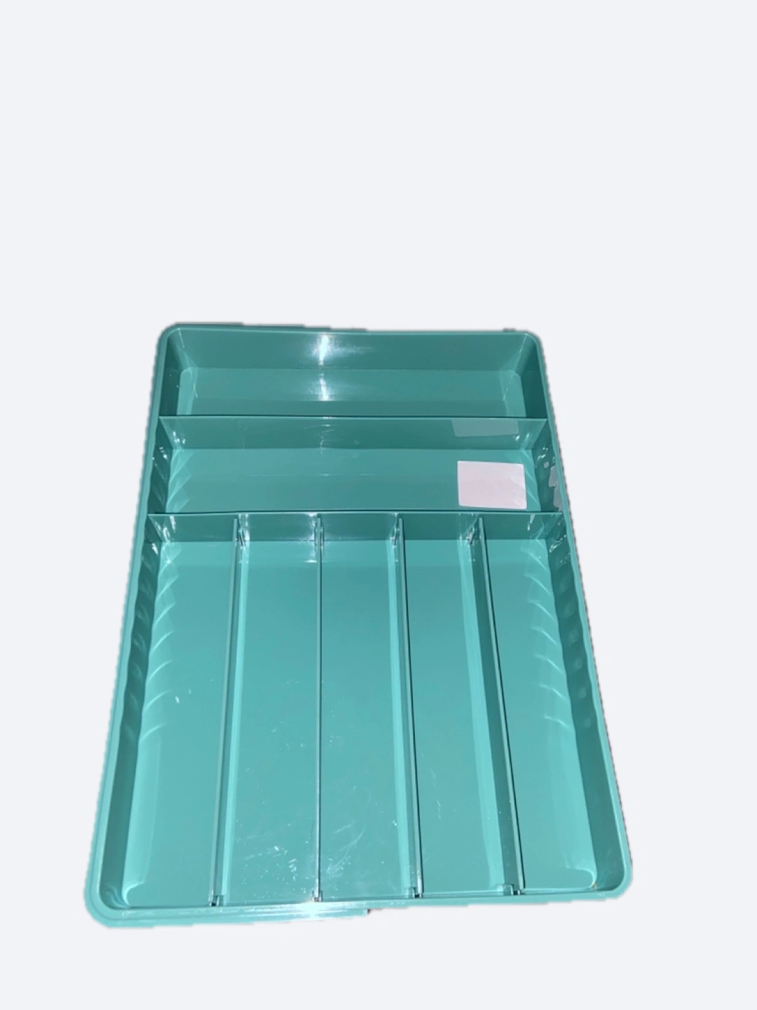 New in box, turquoise plastic kitchen drawer organizer. Multiple compartments for cutlery. Measures approximately 12.9" x 17.25". Sells for $27plus tax on Amazon. Asking $15 or best offer