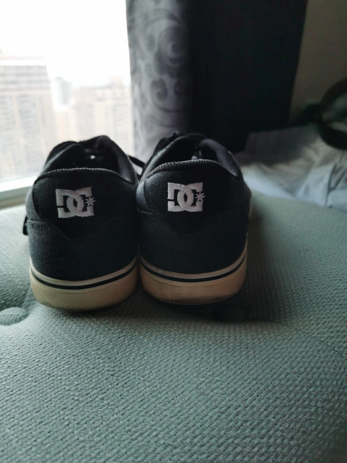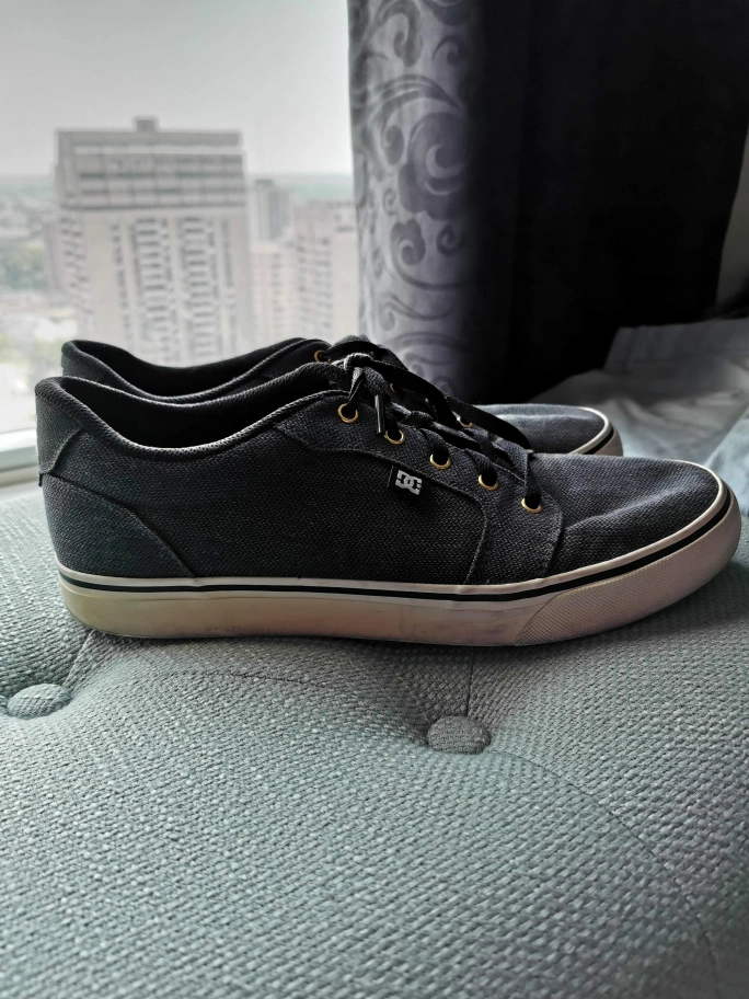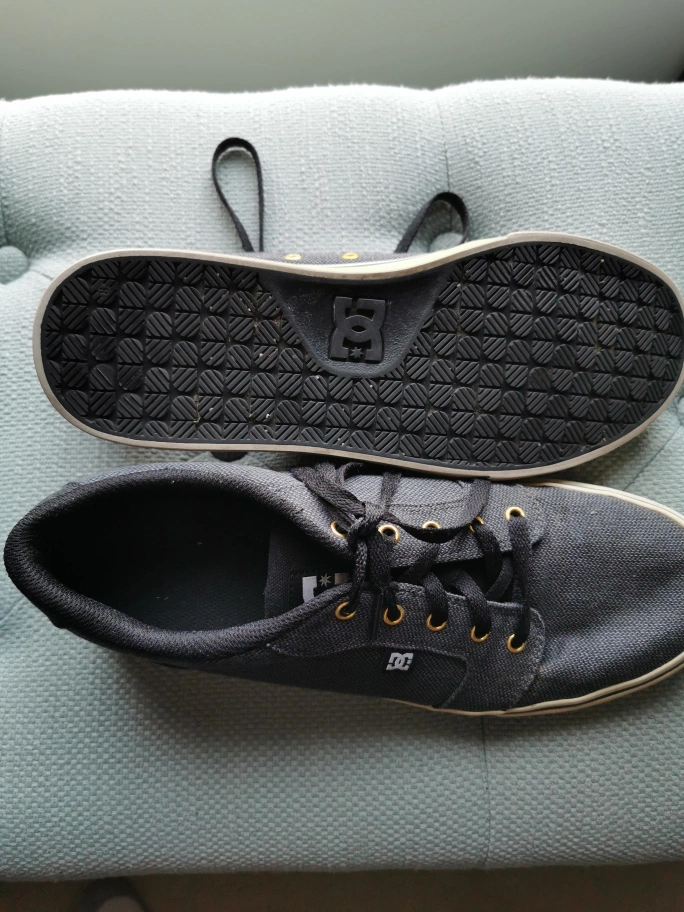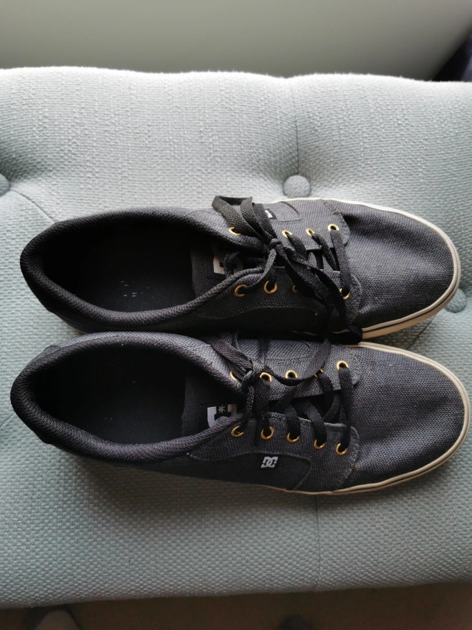 Pair of men's DC Shoes. Black canvas upper, gold eyelets. Low-top style. Pre-owned, good condition. Size 11. Try it on an see if you like it! Reason for offering this second pair of DC Shoes is that I really do not wear them anymore and I have limited space for them. Thank you π Karrot Community London!π