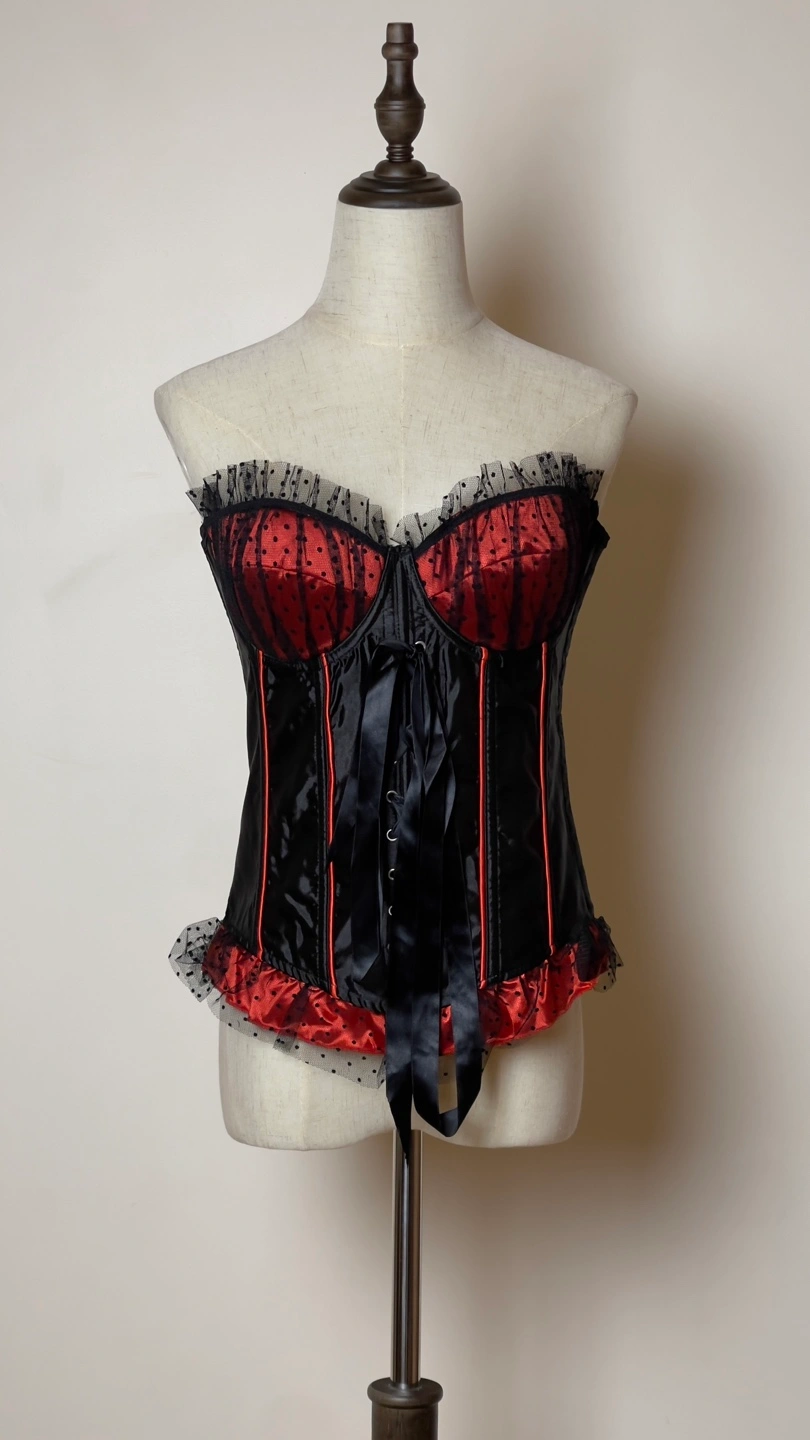 Stunning corset, black satin with red polka dot accents. Lace trim. Back lacing. Great for costumes or special occasions.