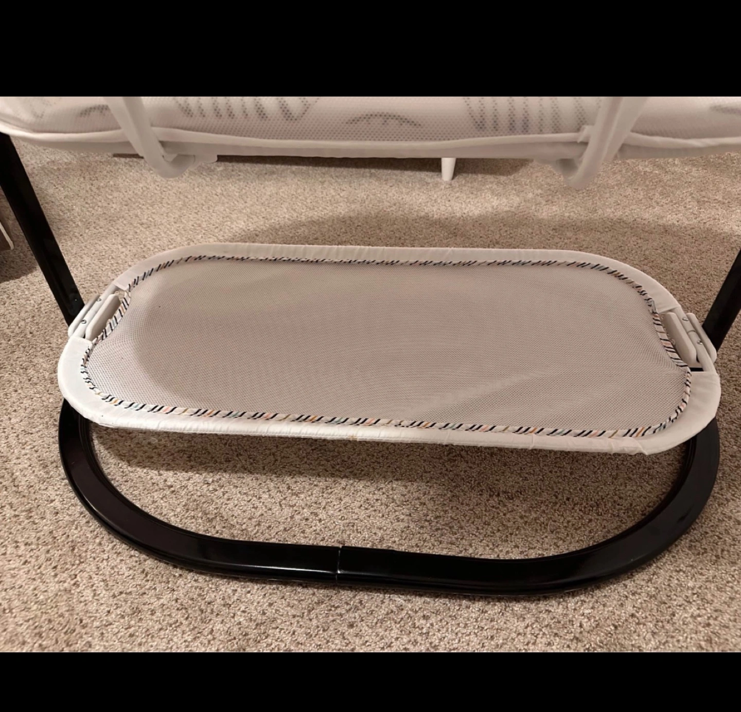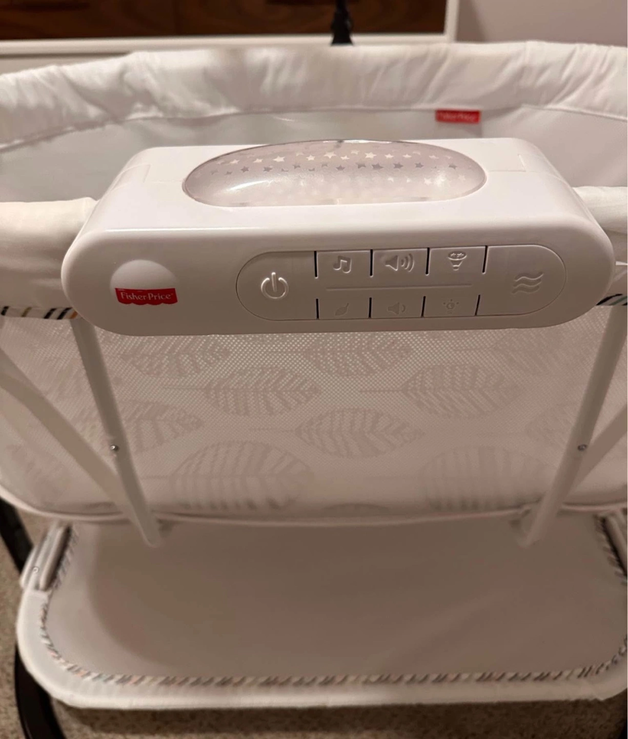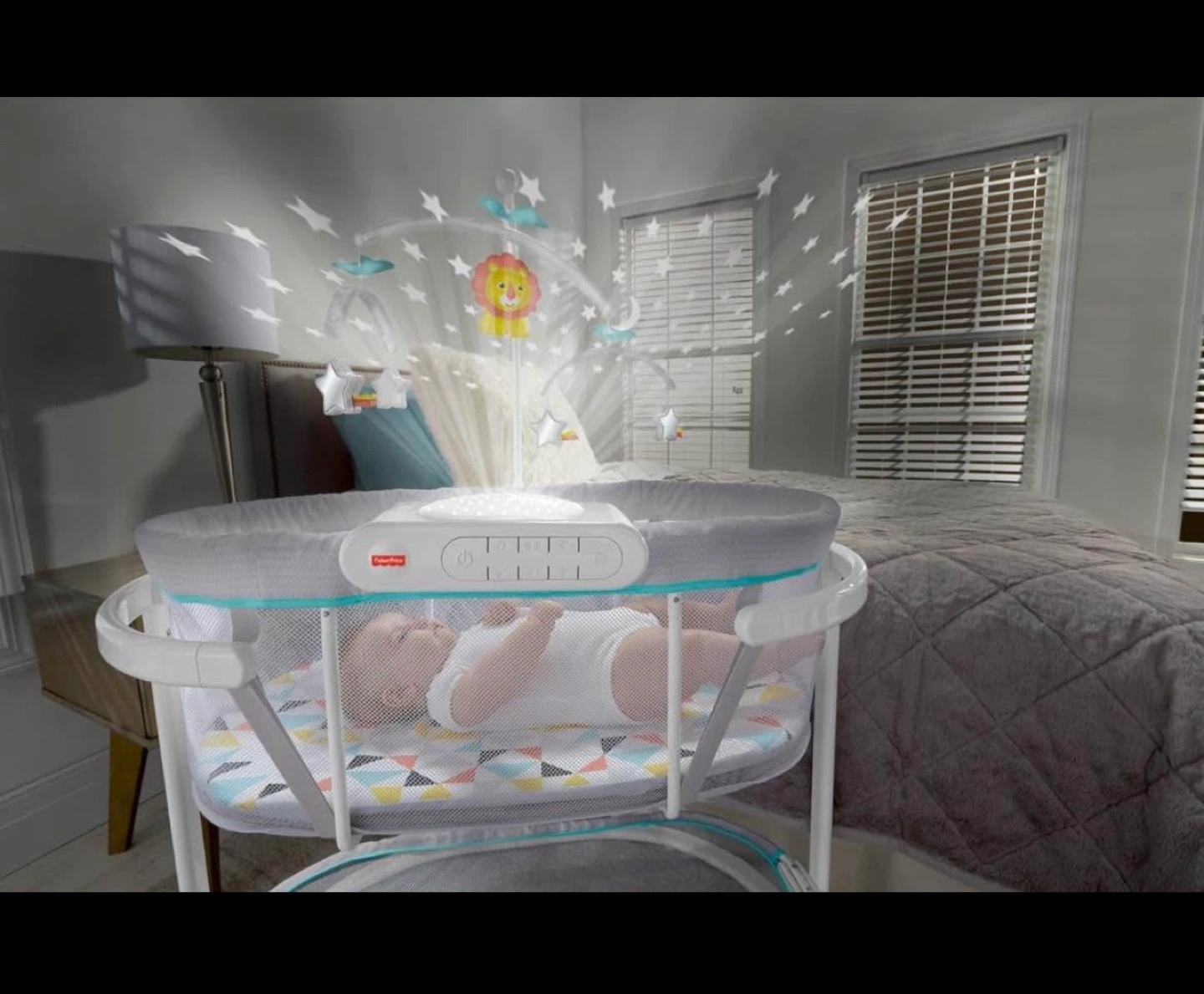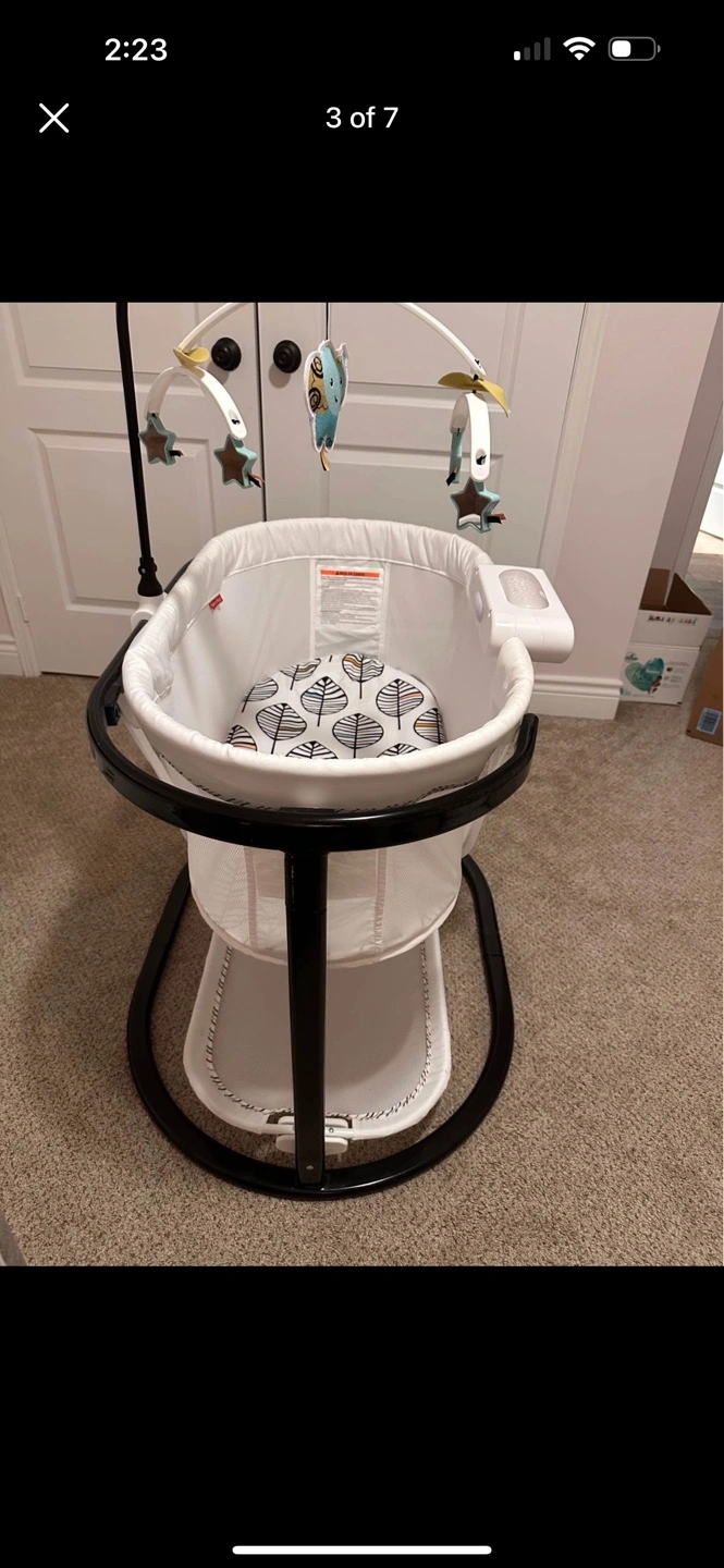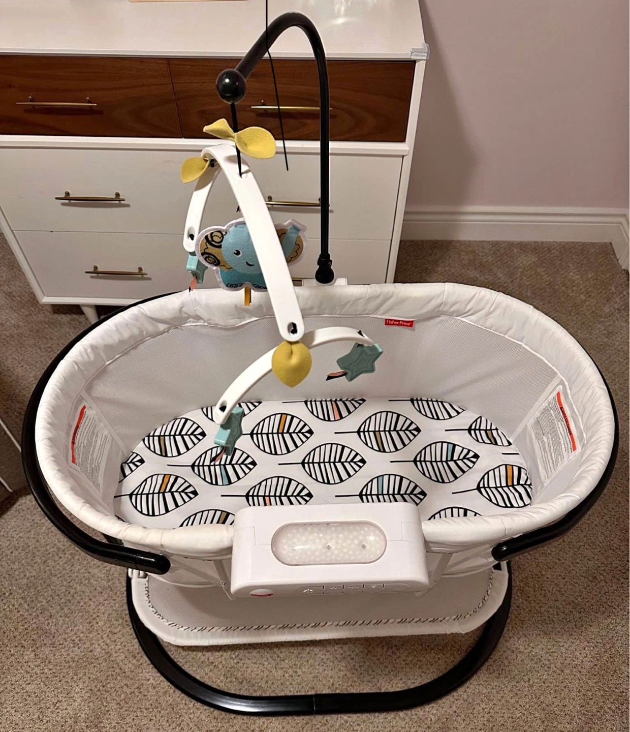Baby bassinet with mobile, lights, and sounds. Features a vibrating base. Great for newborns. Used only for few dayss , like new
