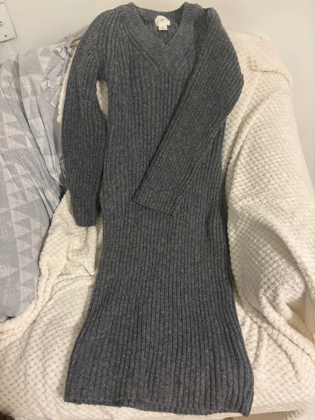 Long-sleeved, ribbed knit sweater dress. V-neckline. Relaxed fit. Grey colour. Once worn