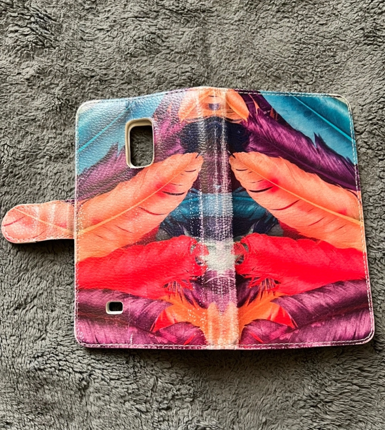 Two stylish wallet phone cases for a Samsung Galaxy S4. Floral and feather designs. Card slots inside. Good used condition.