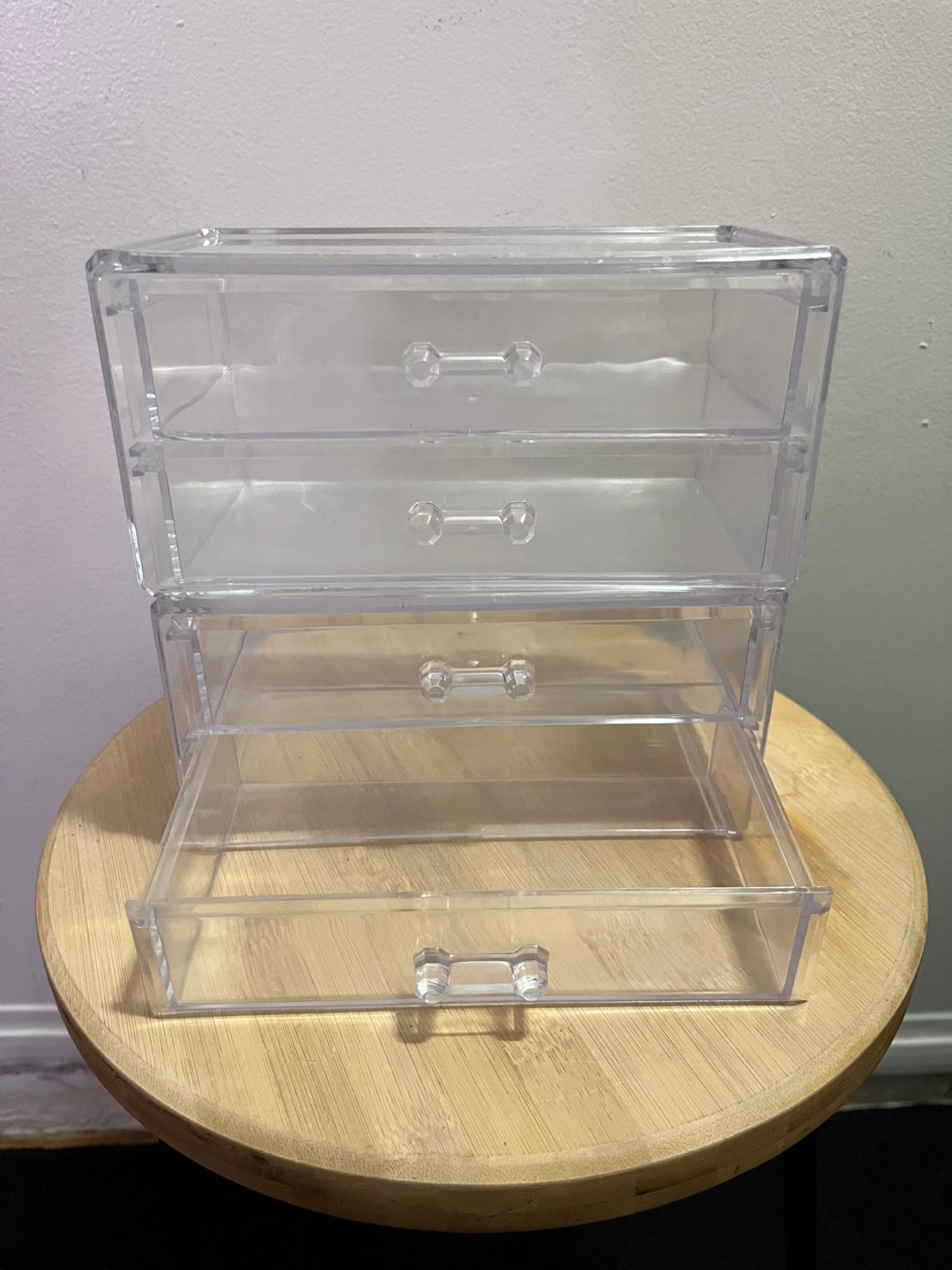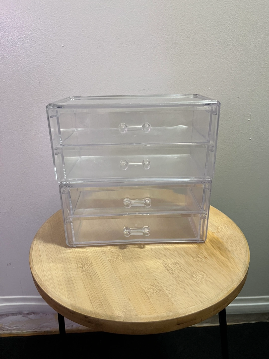 Two stackable drawer organizers. Made of clear acrylic. Each organizer has two drawers. Ideal for organizing small items. Overall measurements (for each organizer) are just under 7.5 in wide, 4 in deep. Each drawer has 1.5 in clearance. LOCATION: This item is for pickup at my home near King St West and Jameson Avenue in Parkdale (exact address only given for confirmed pickups).