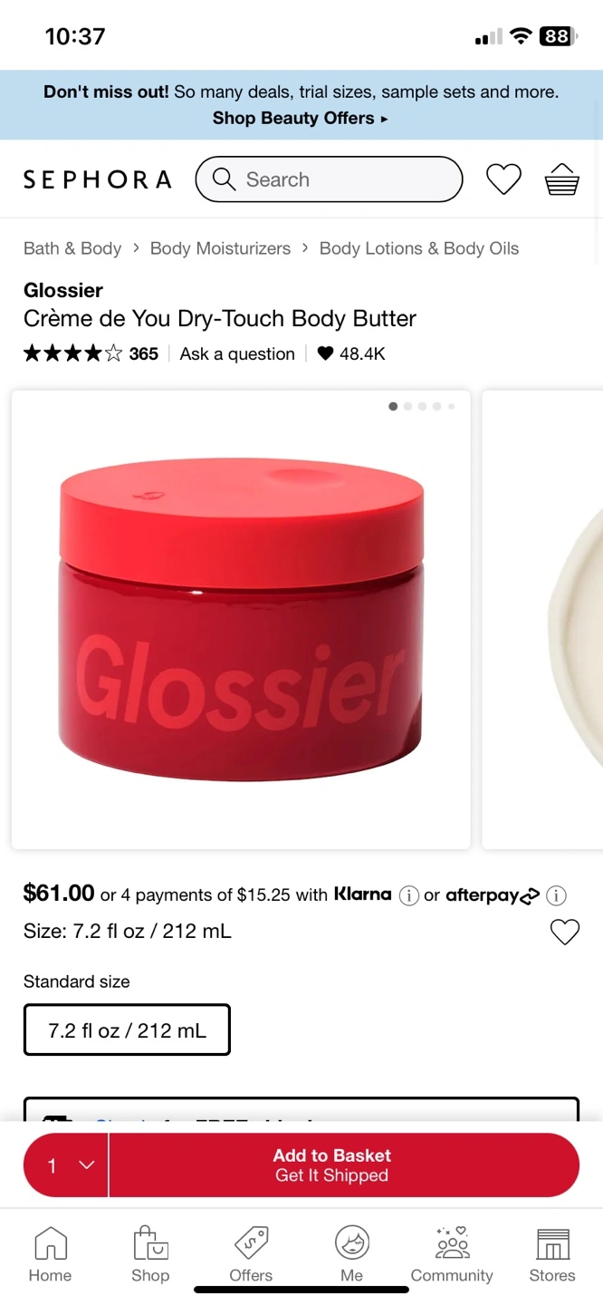 Glossier body butter, 7.2 fl oz / 212 mL. Standard size. Got as a gift, didn’t like the scent and can’t return. Retails $61 before tax, selling for 50