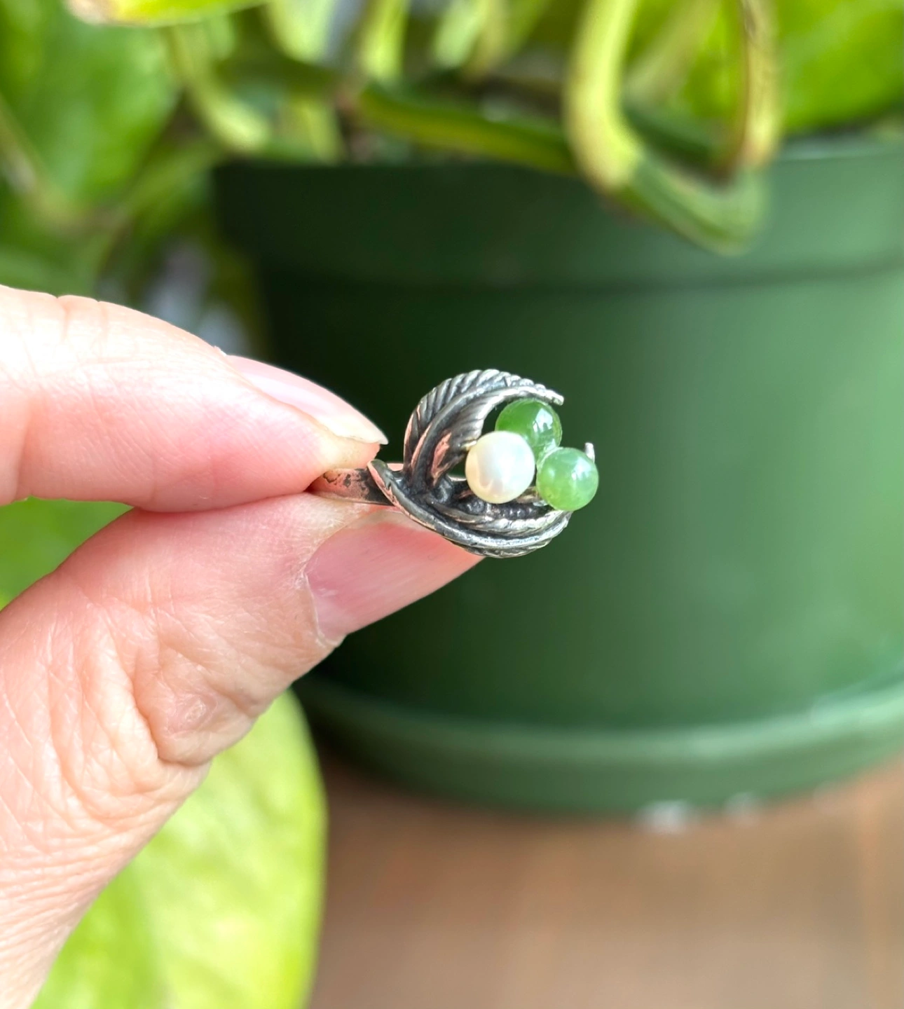 Unique ring featuring a sterling silver band. Small jade stones and a pearl accent. Elegant and understated design. Perfect for everyday wear or a special occasion. It’s a one of a kind gift, I am happy to offer you a complimentary jewelry box!🥰💝🤝