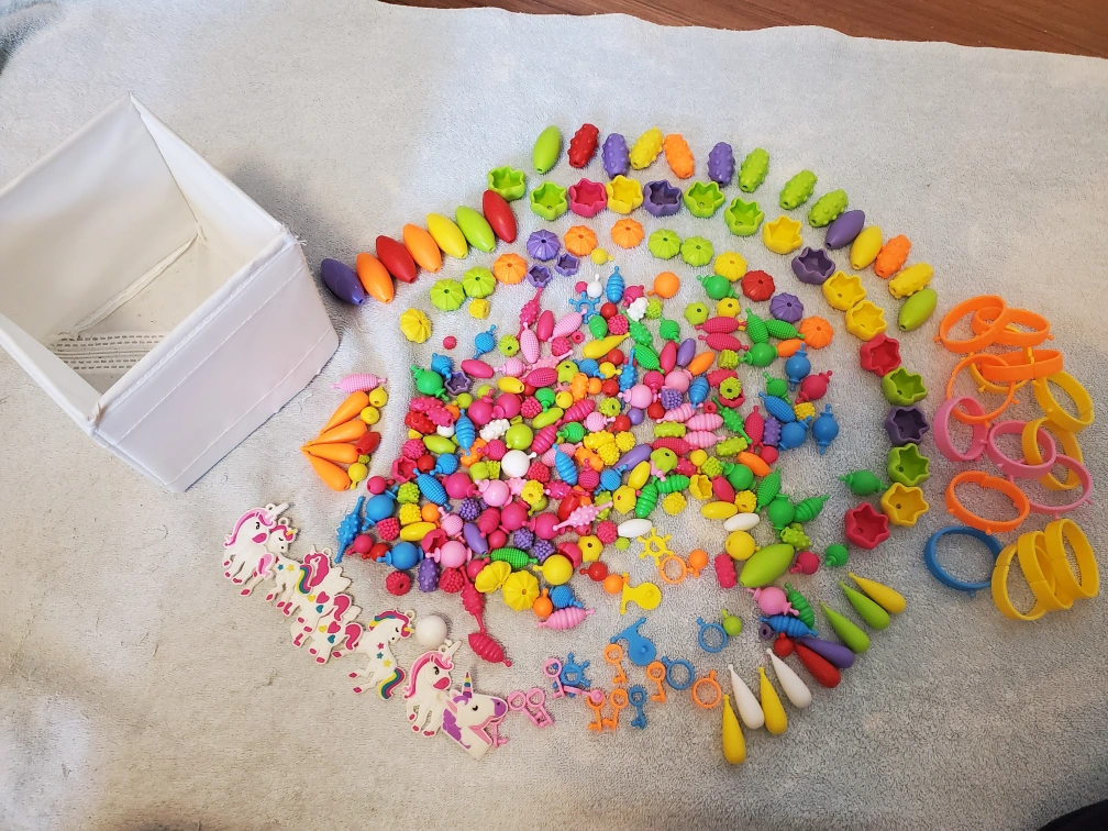 Colorful beads and charms, perfect for jewellery making or crafts. Includes various shapes, colours and unicorn charms. Sold as a bulk lot. Comes with a small storage container.