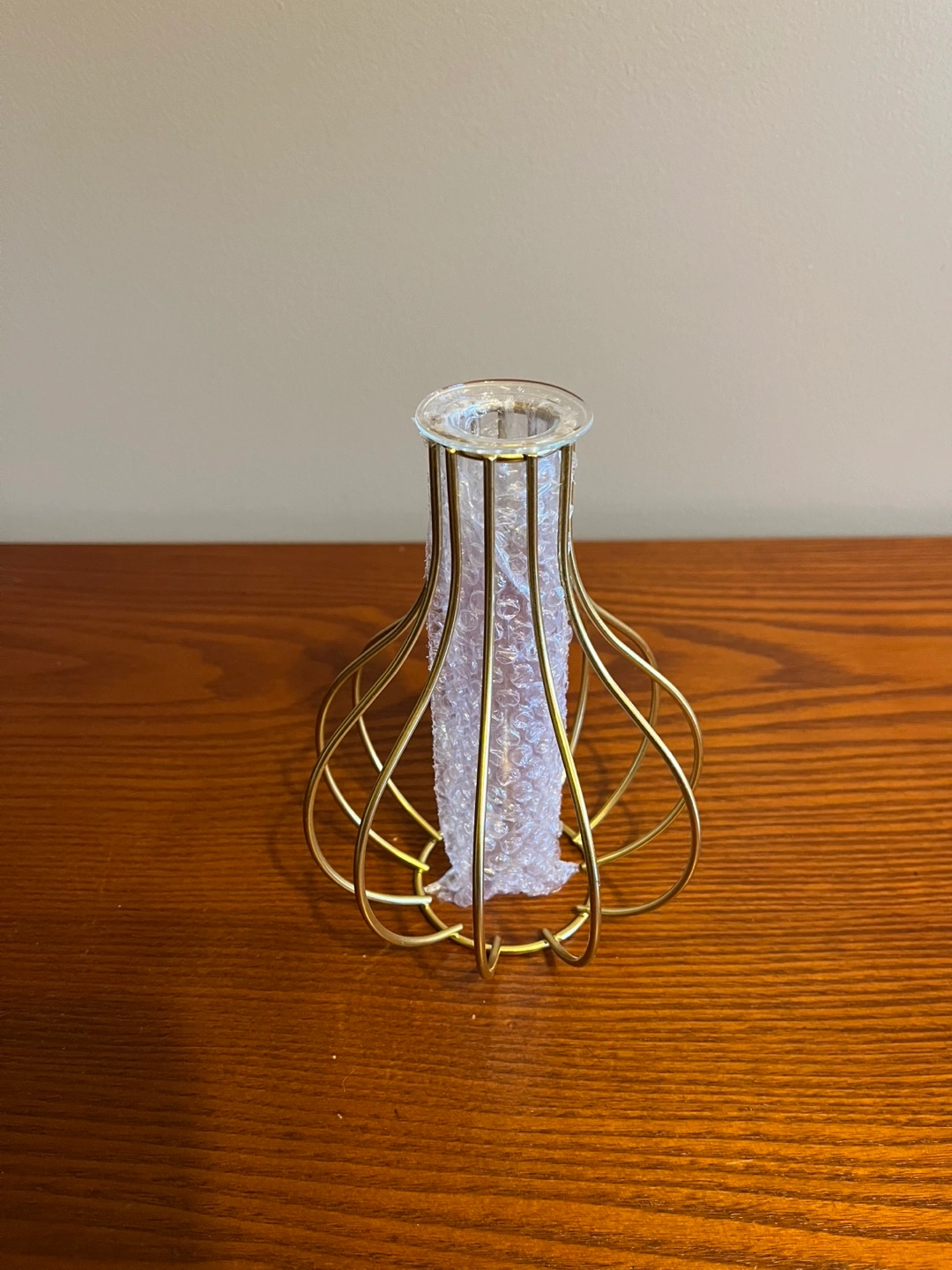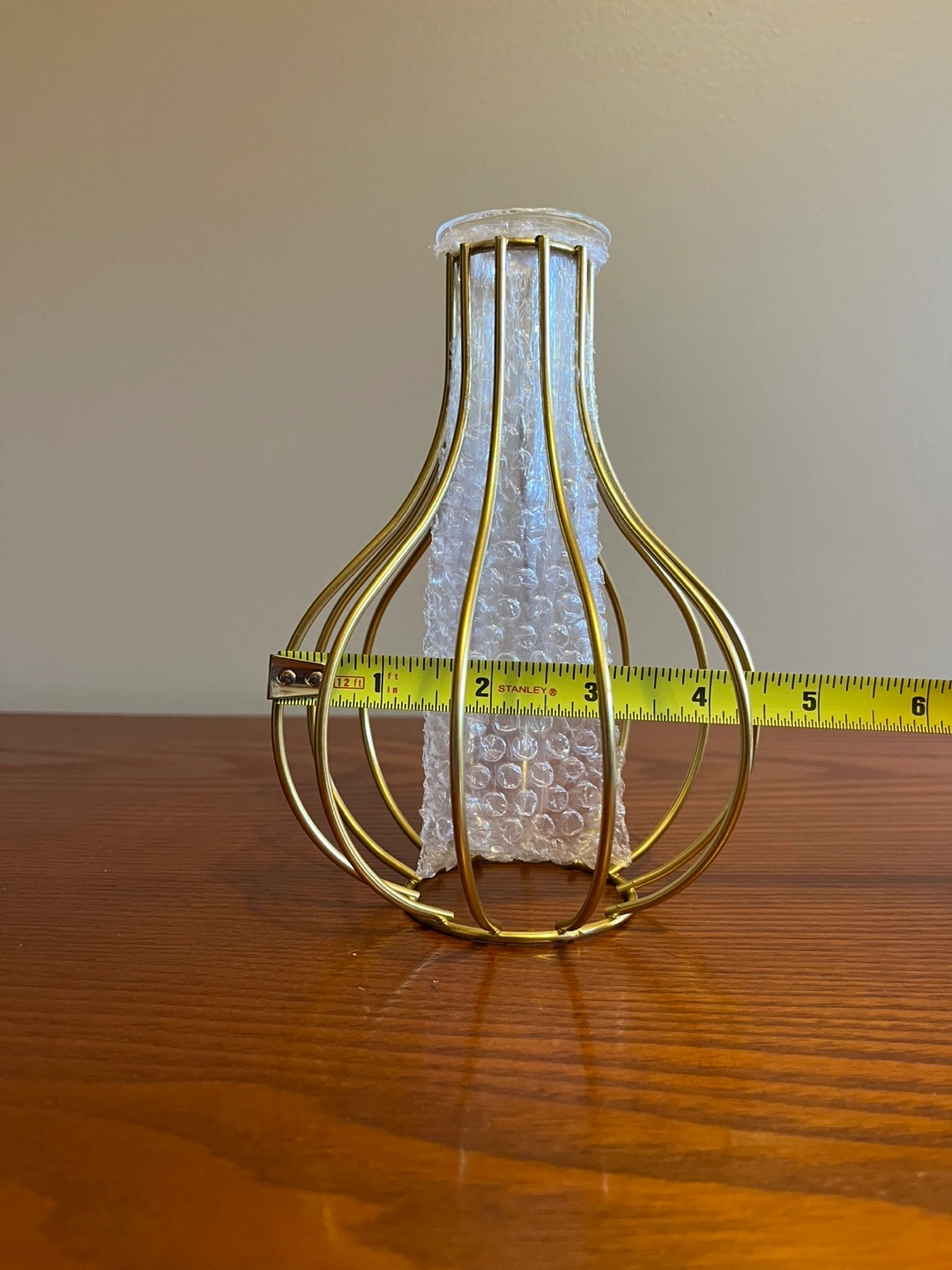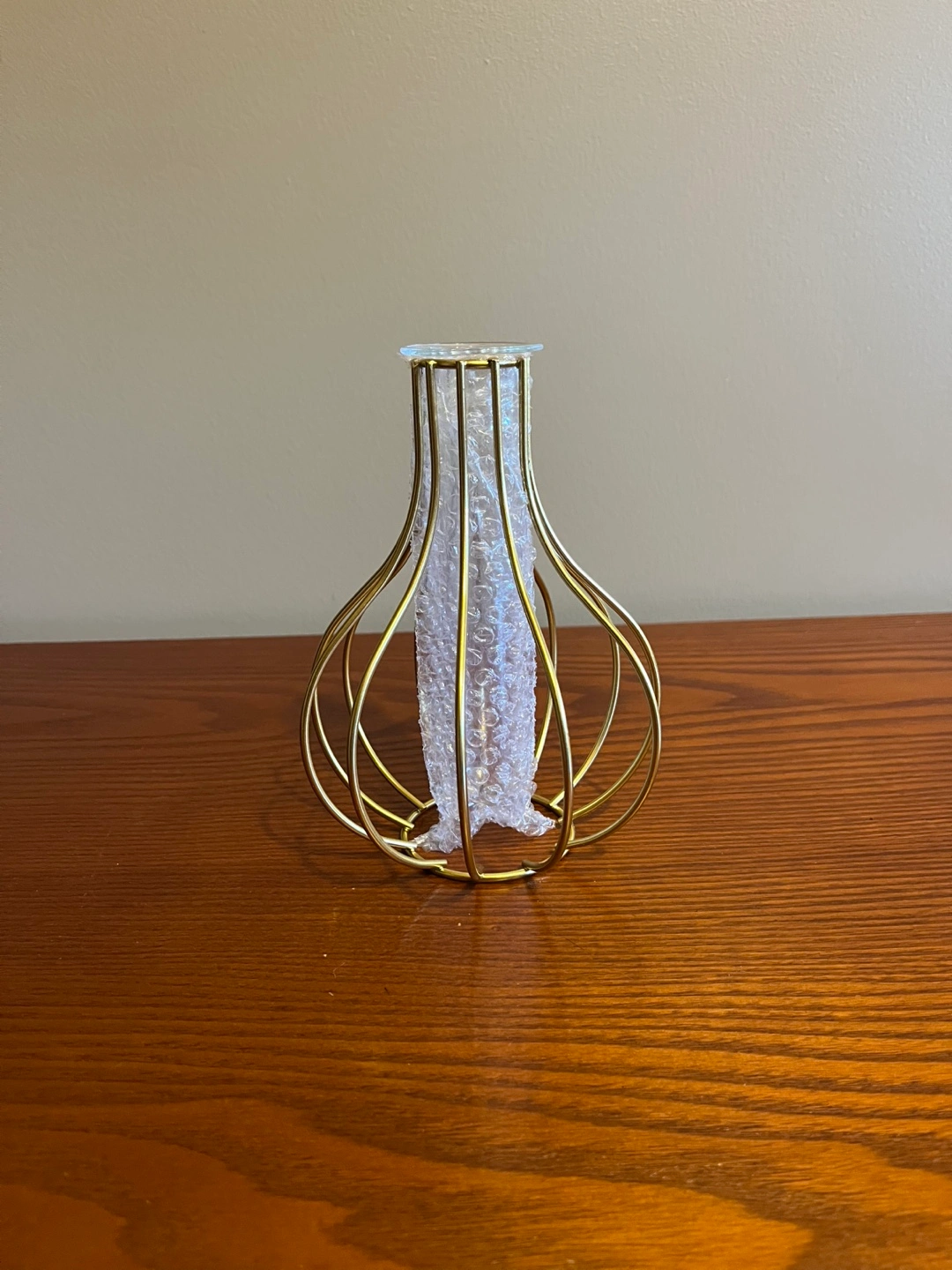 BRAND NEW (Never used) Golden metal material iron crafted glass tube decorative vase. Measurements are shown in the pictures. Last picture is for price reference only. Cross posted.